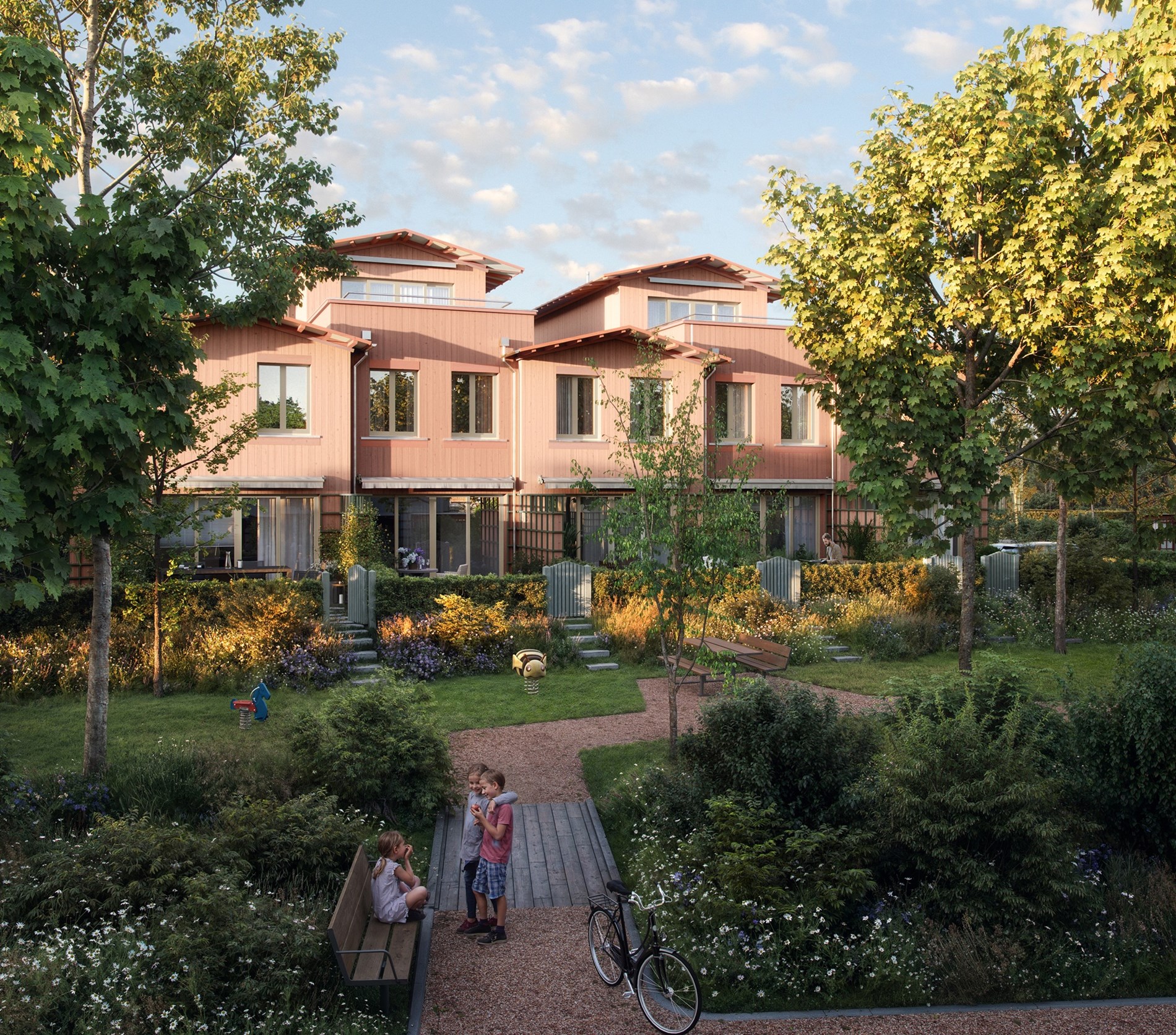 Alle illustrasjoner er utarbeidet basert på tegninger av fremtidige bygg. Illustrerte fasader vil kunne avvike fra ferdige bygg. Elementer og materialer i illustrasjonene kan avvike fra standardleveranse. Øvrige bygg, beplantning, vegetasjon og fellesarealer er ikke endelig prosjektert.