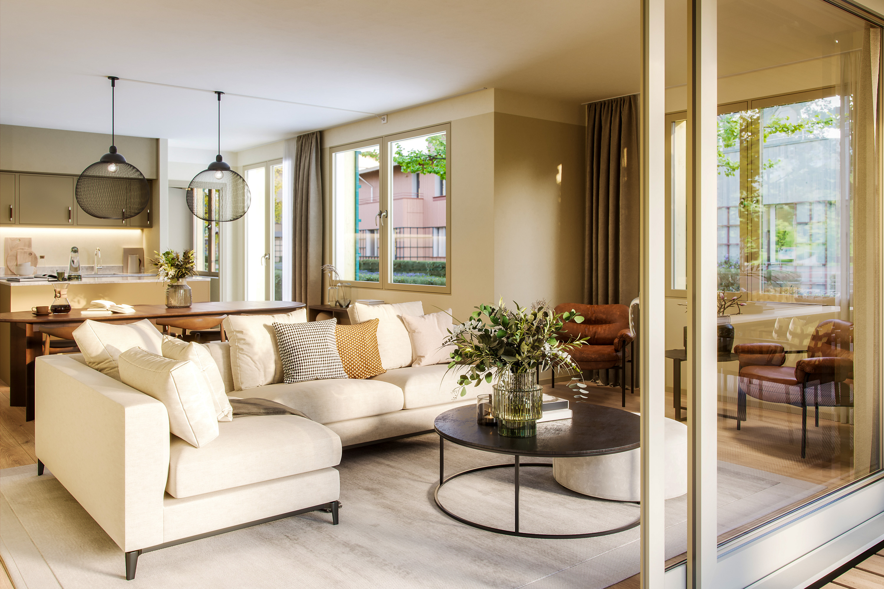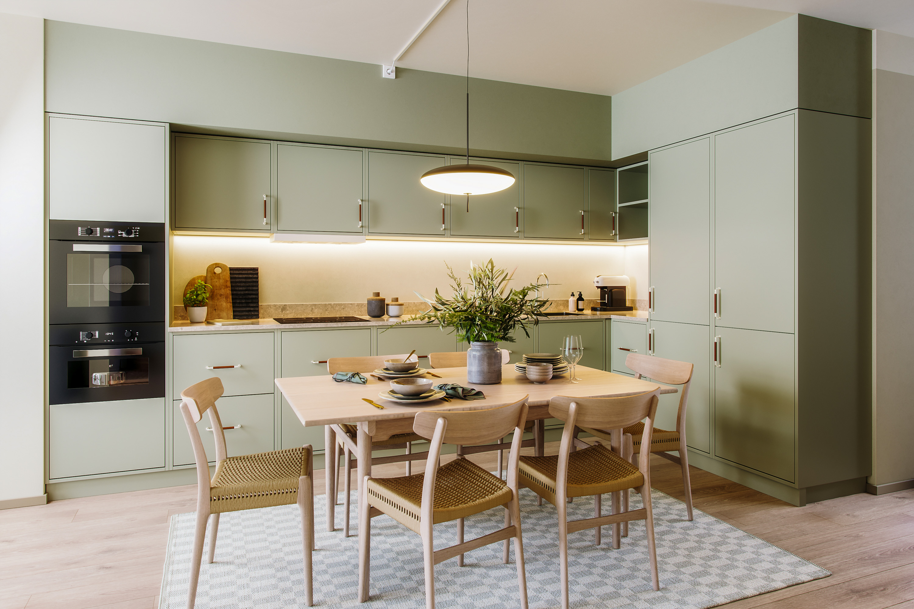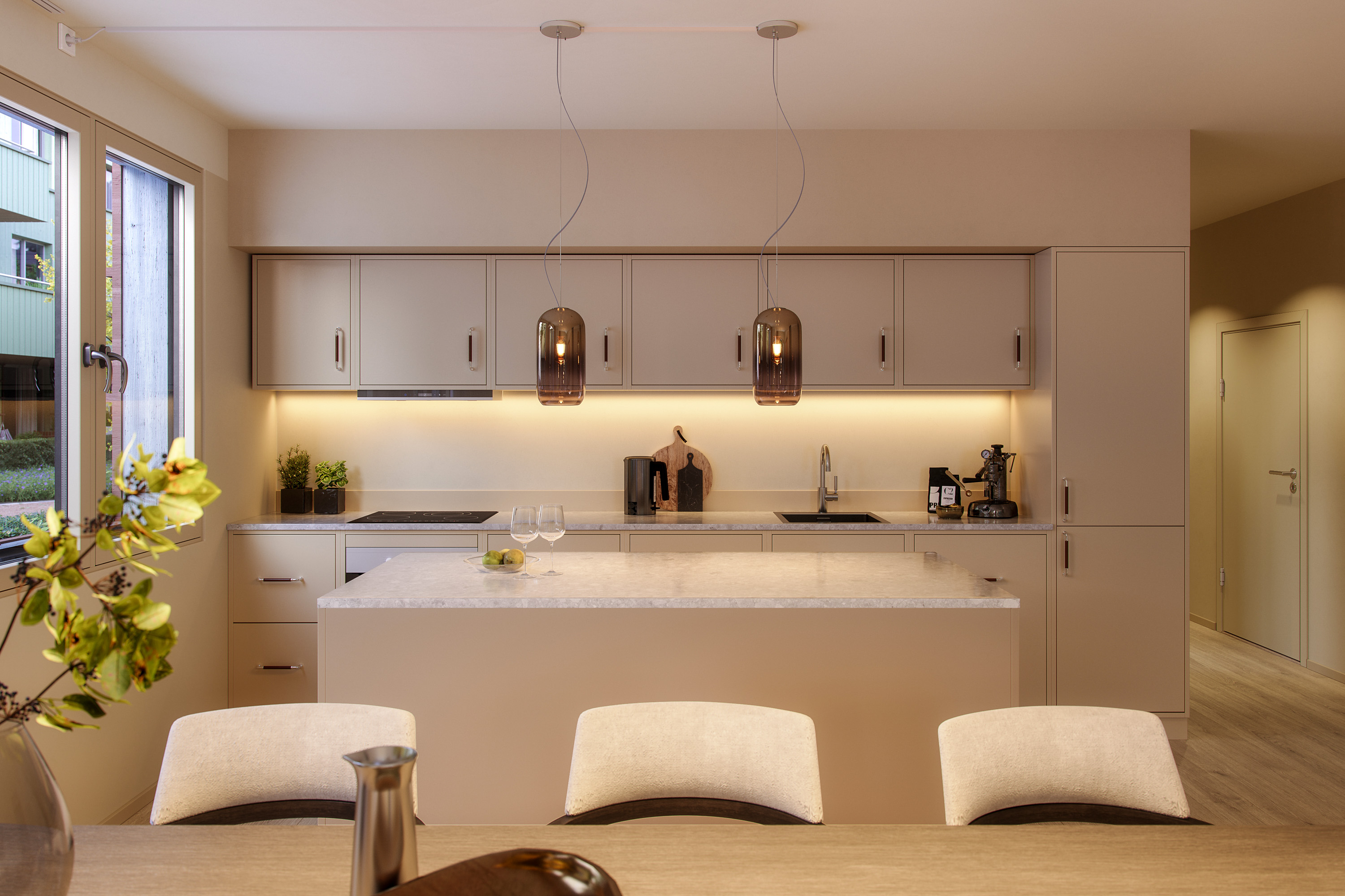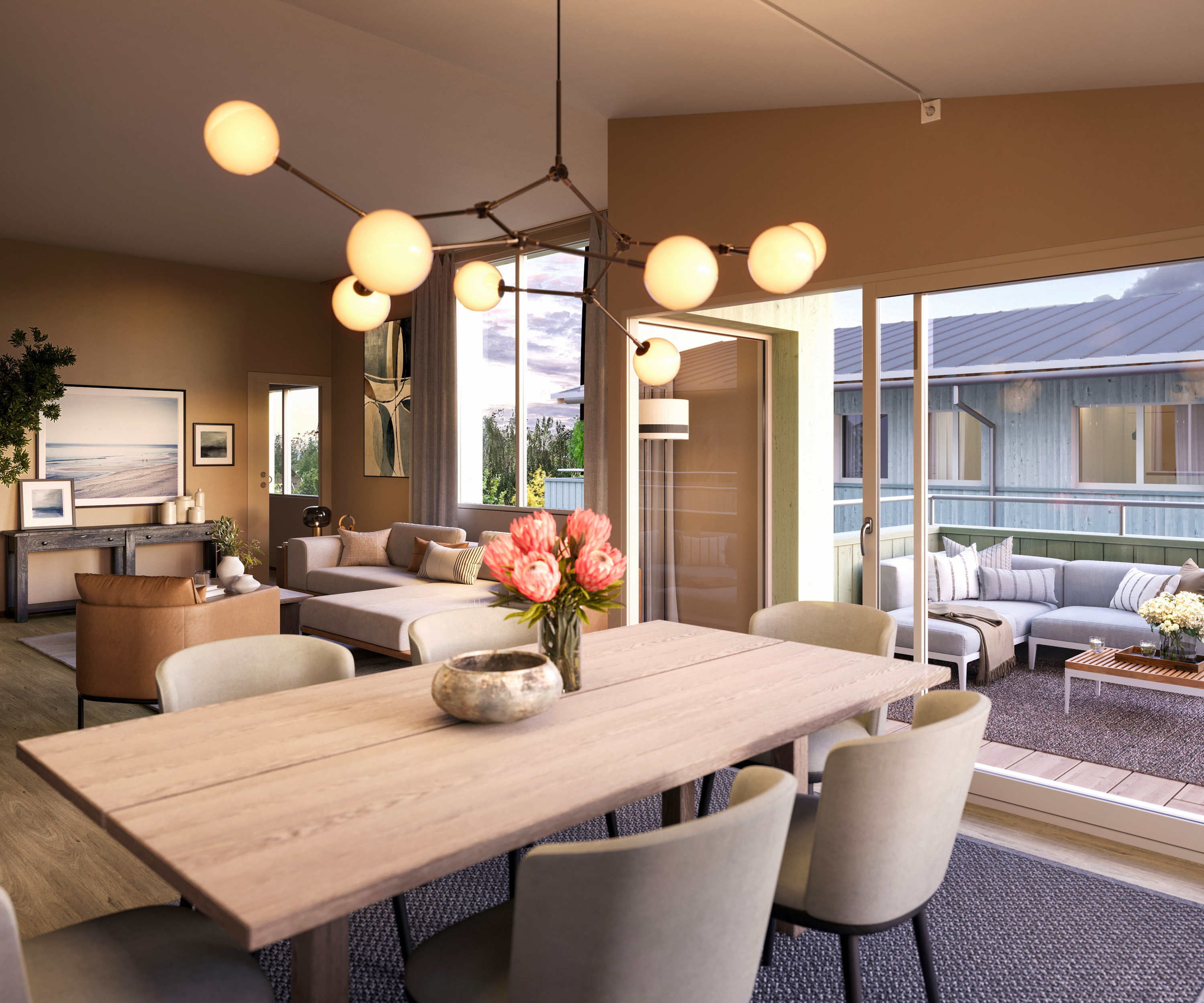 Alle illustrasjoner er utarbeidet basert på tegninger av fremtidige bygg. Illustrerte fasader vil kunne avvike fra ferdige bygg. Elementer og materialer i illustrasjonene kan avvike fra standardleveranse. Øvrige bygg, beplantning, vegetasjon og fellesarealer er ikke endelig prosjektert.