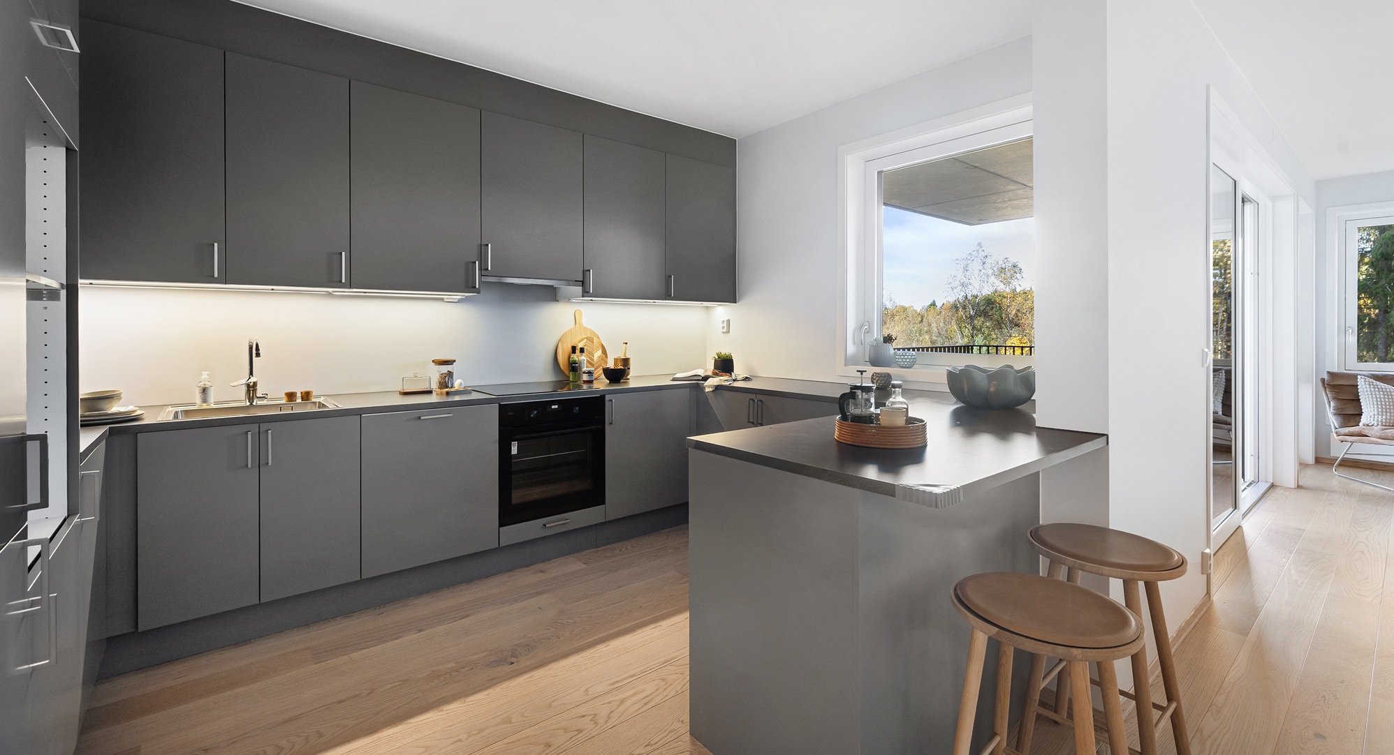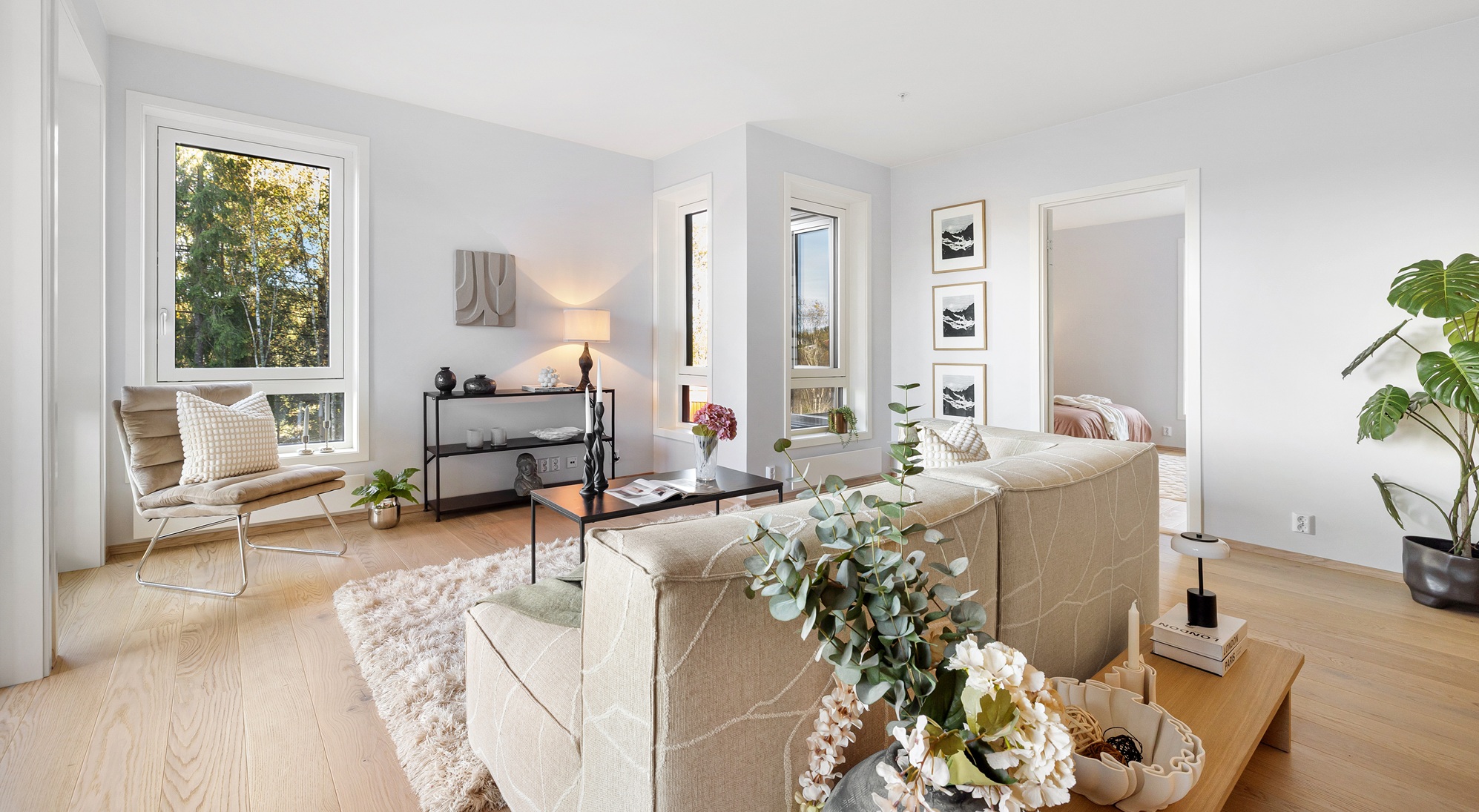 De første beboerne flyttet inn i 2021, og nå er de to siste husene, hus G og H, også innflyttingsklare. Det er kun én ledig leilighet igjen i hus H. Ta gjerne kontakt for å avtale privat visning, så du får se hvor fint det har blitt!
