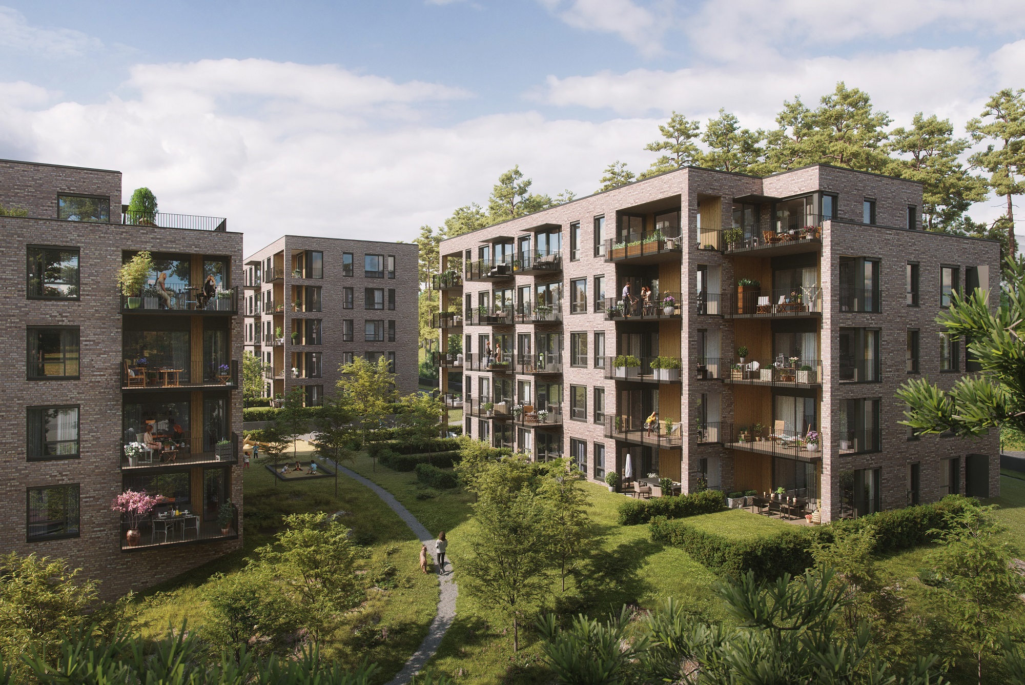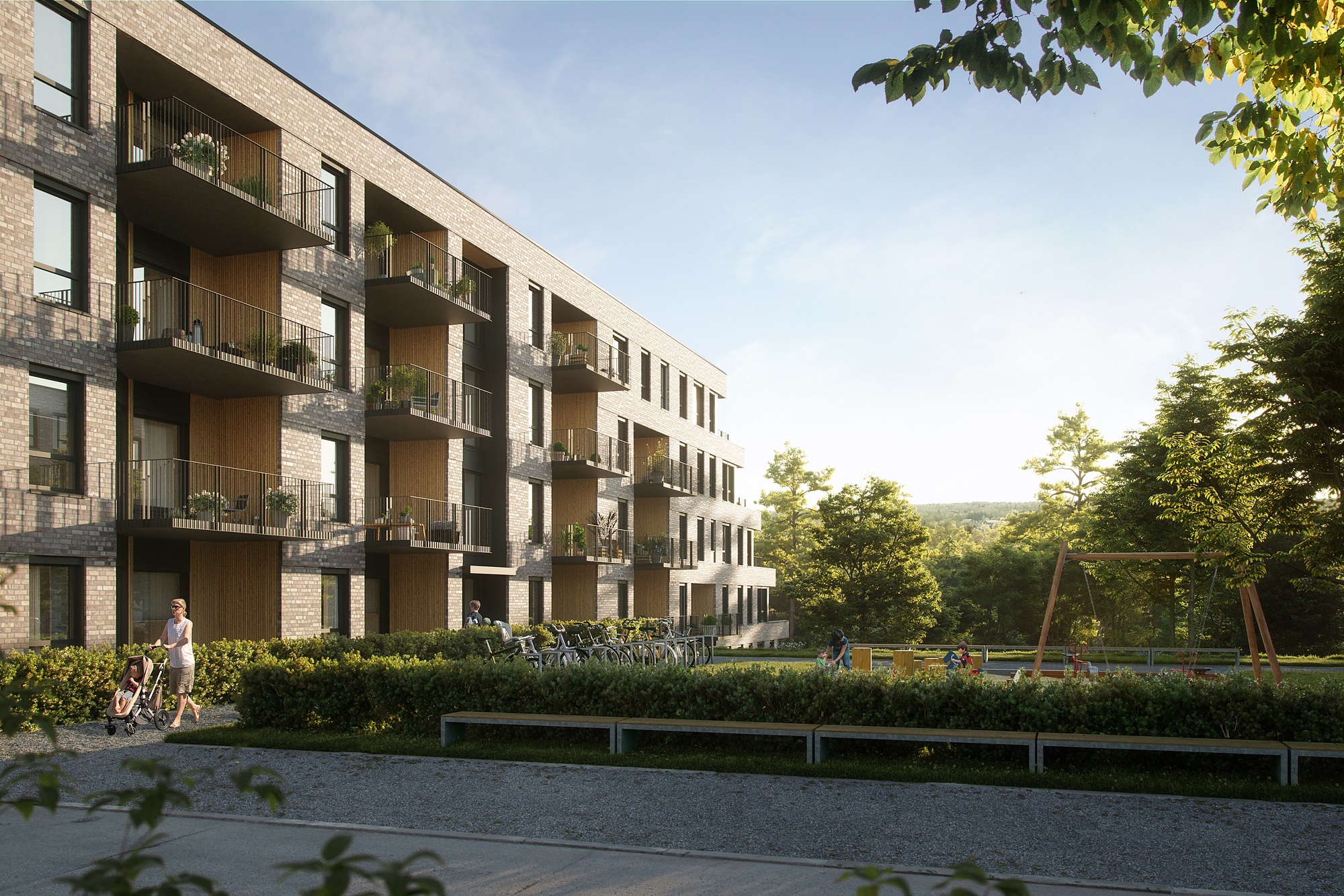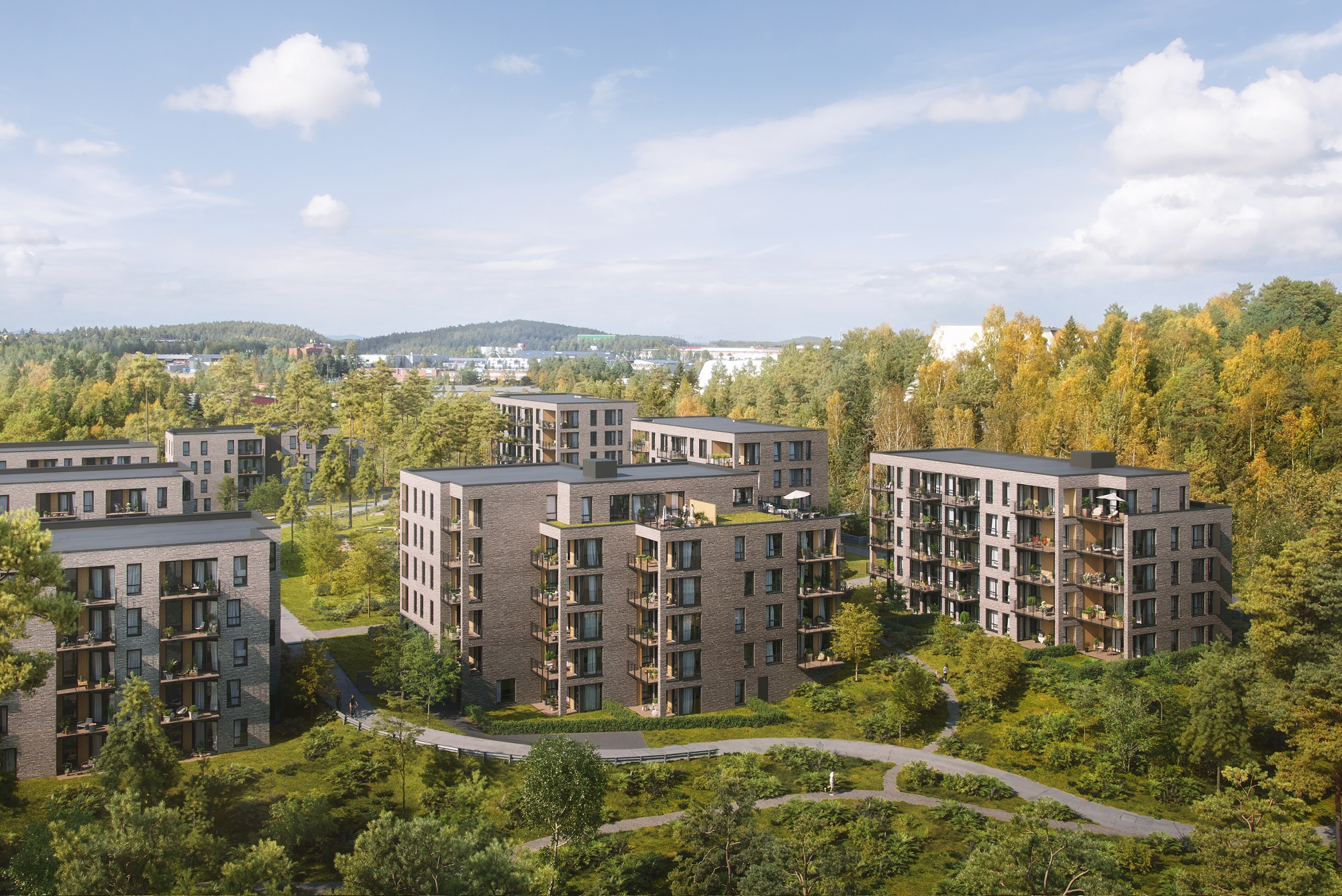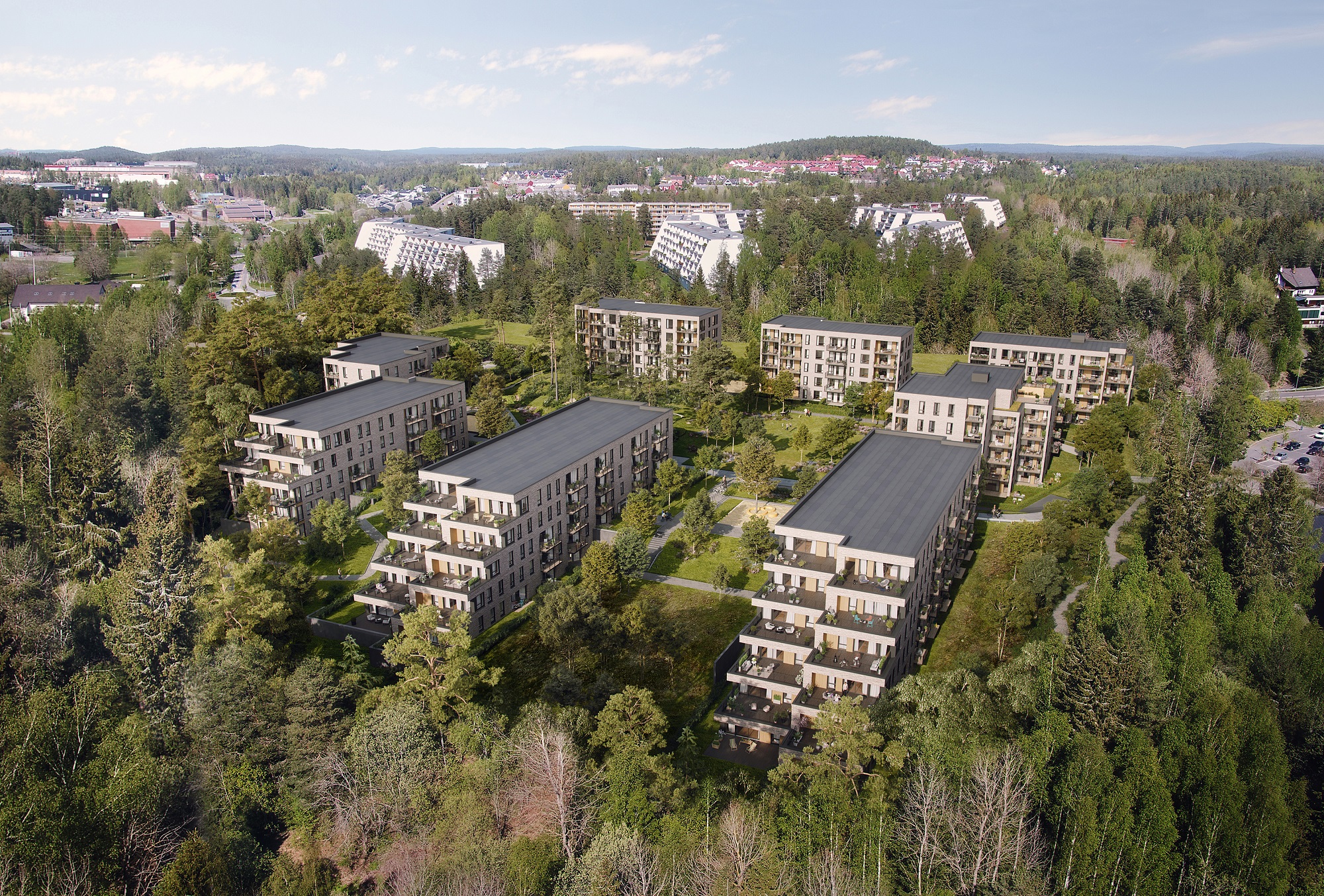 Alle illustrasjoner er utarbeidet basert på tegninger av fremtidige bygg. Illustrerte fasader vil kunne avvike fra ferdige bygg. Elementer og materialer i illustrasjonene kan avvike fra standardleveranse. Øvrige bygg, beplantning, vegetasjon og fellesarealer er ikke endelig prosjektert.