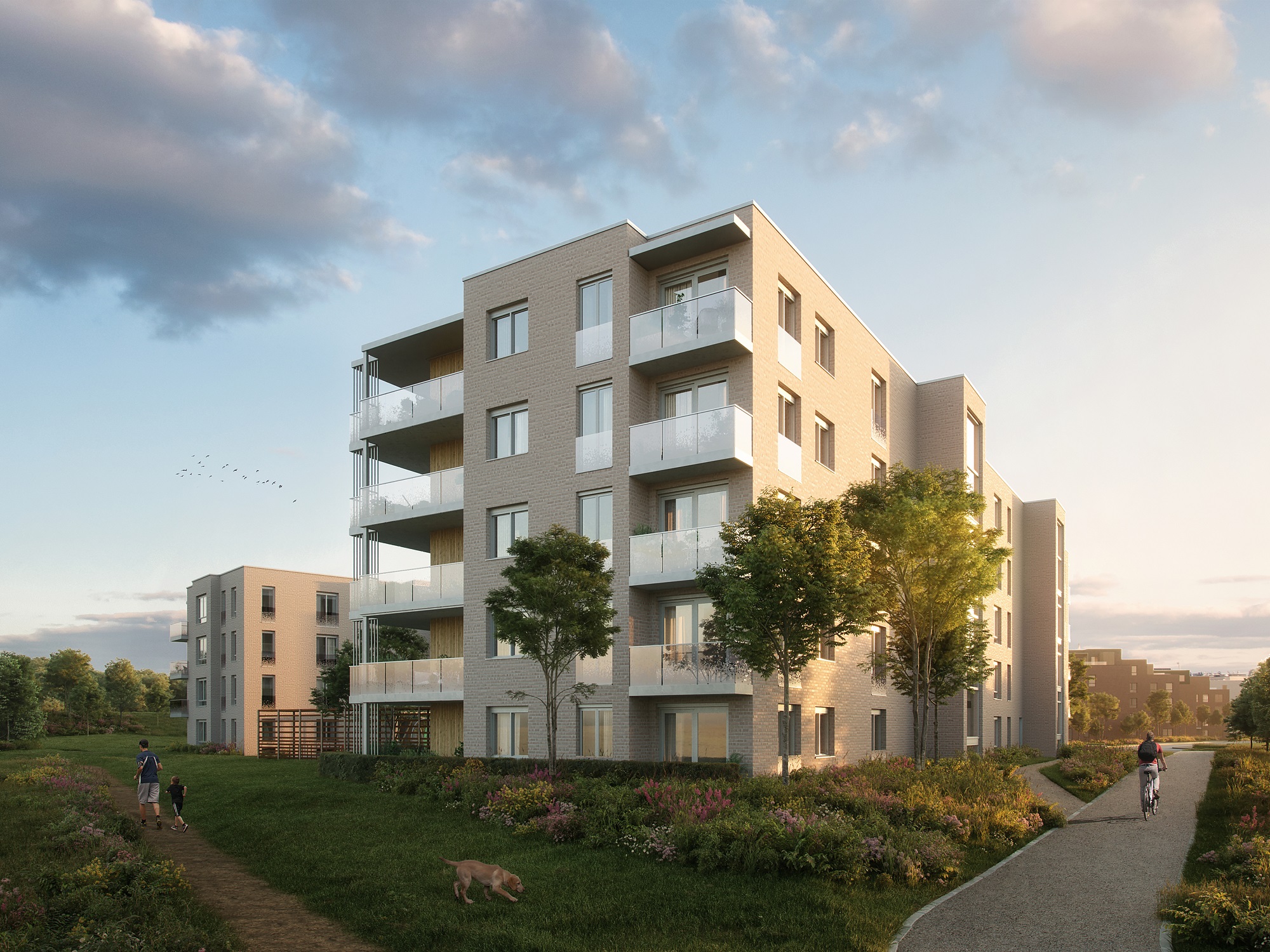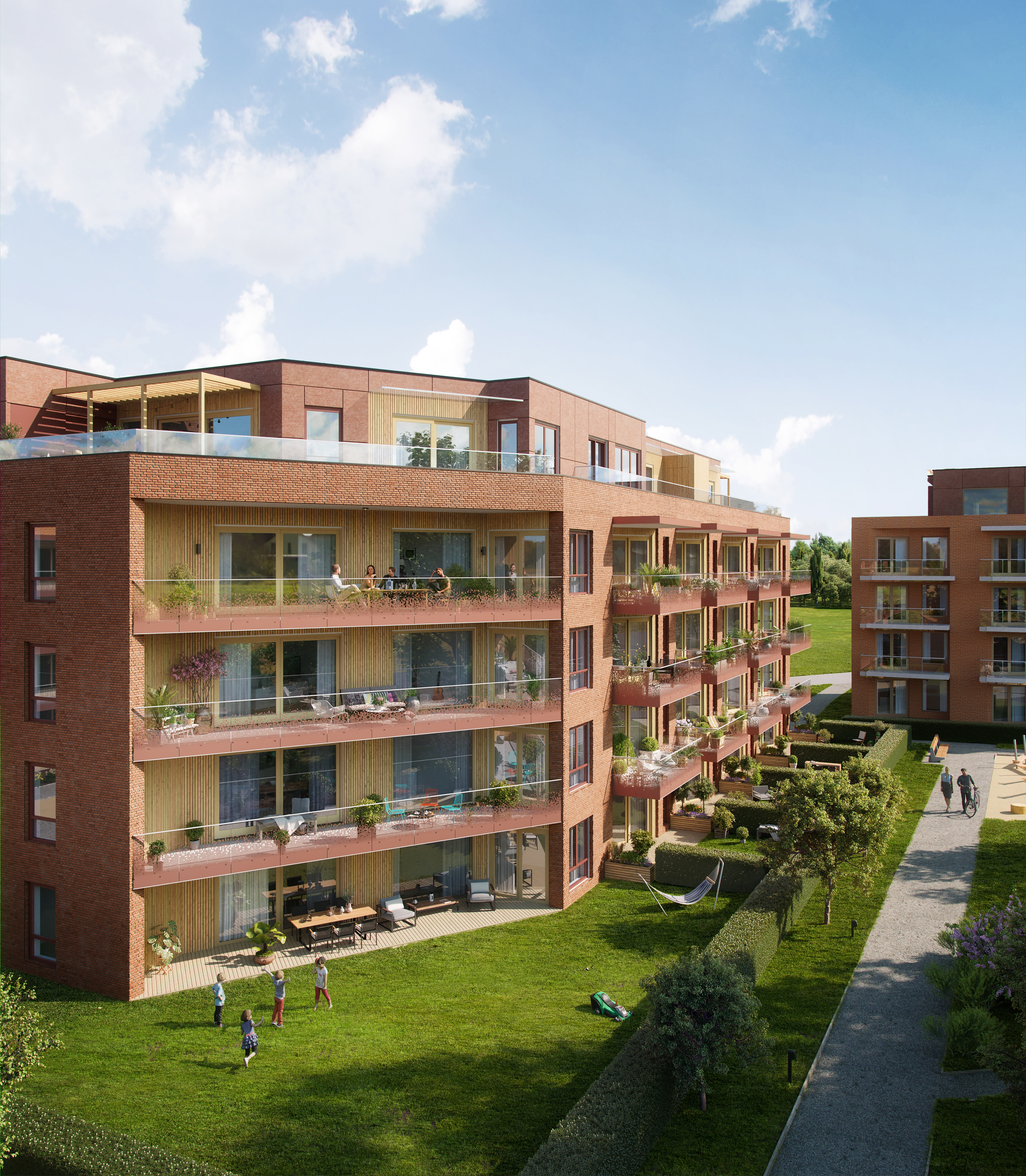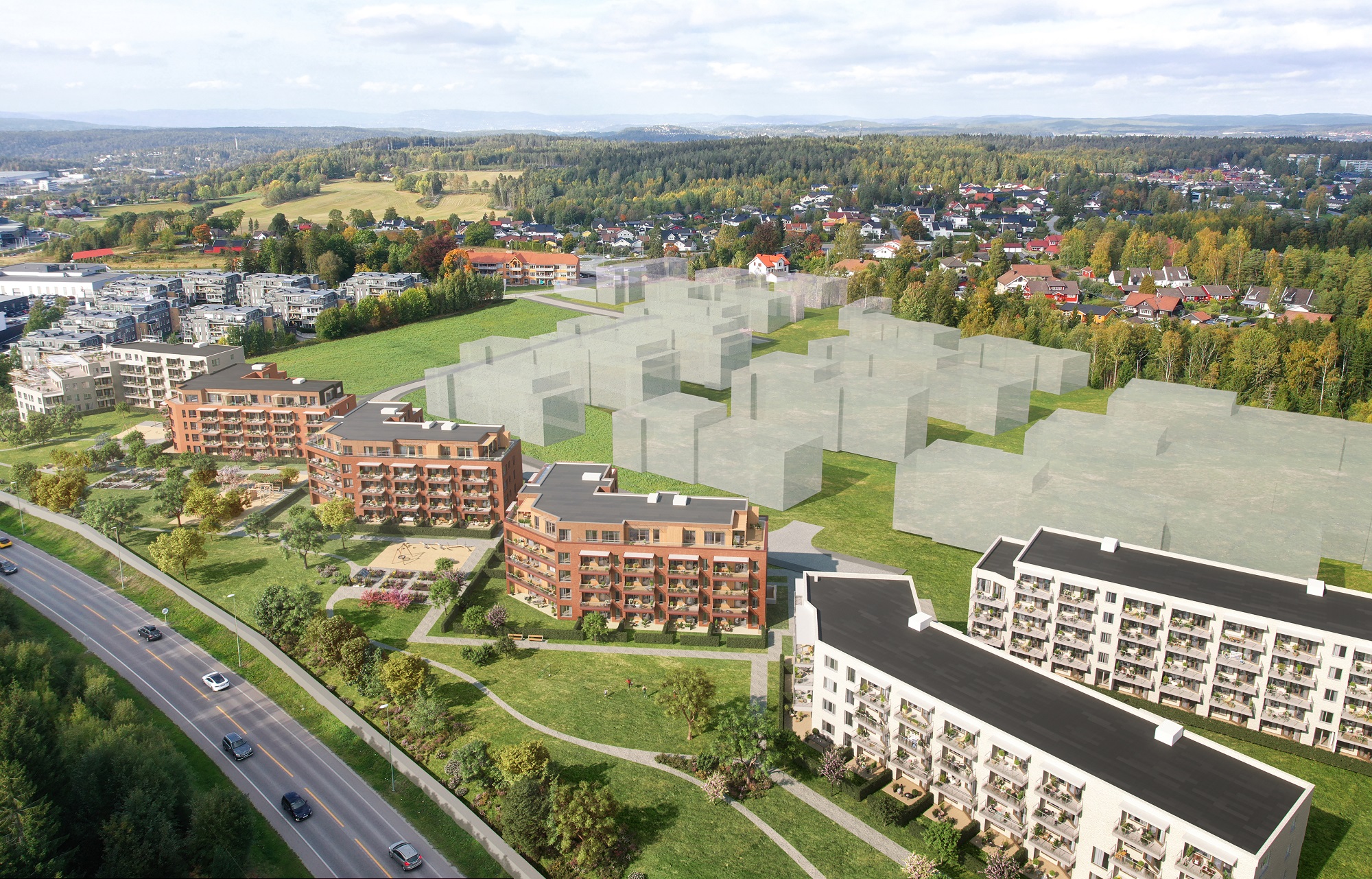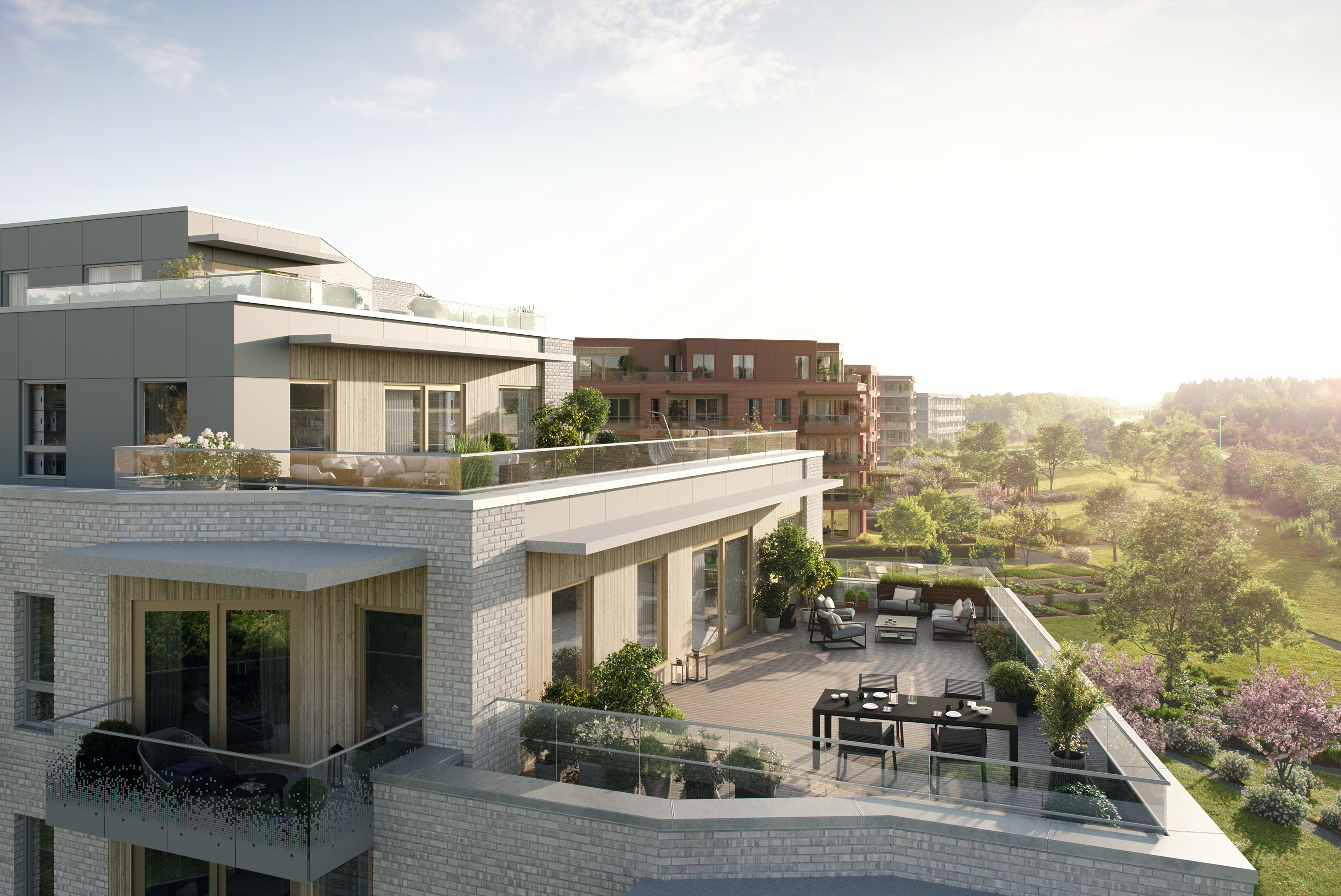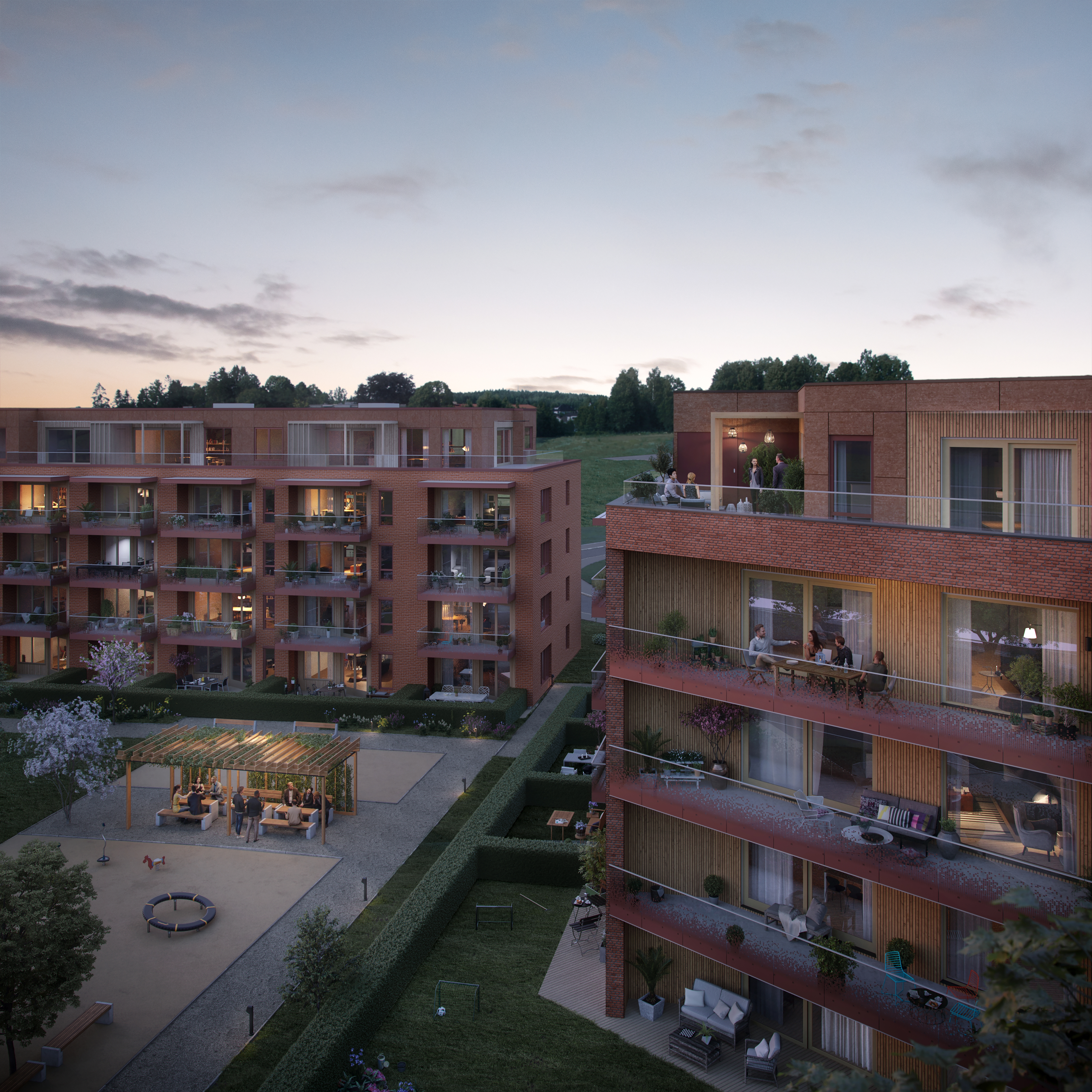 Alle illustrasjoner er utarbeidet basert på tegninger av fremtidige bygg. Illustrerte fasader vil kunne avvike fra ferdige bygg. Elementer og materialer i illustrasjonene kan avvike fra standardleveranse. Øvrige bygg, beplantning, vegetasjon og fellesarealer er ikke endelig prosjektert.