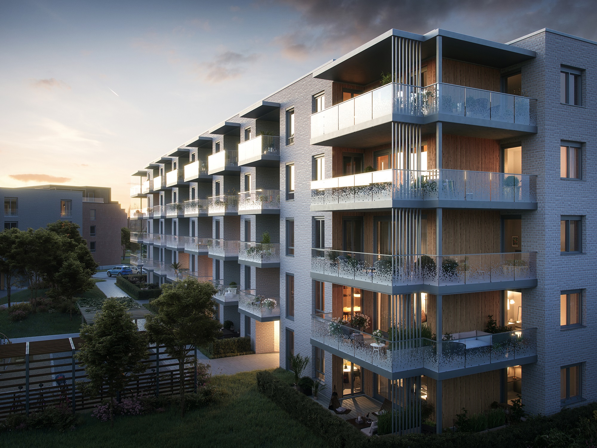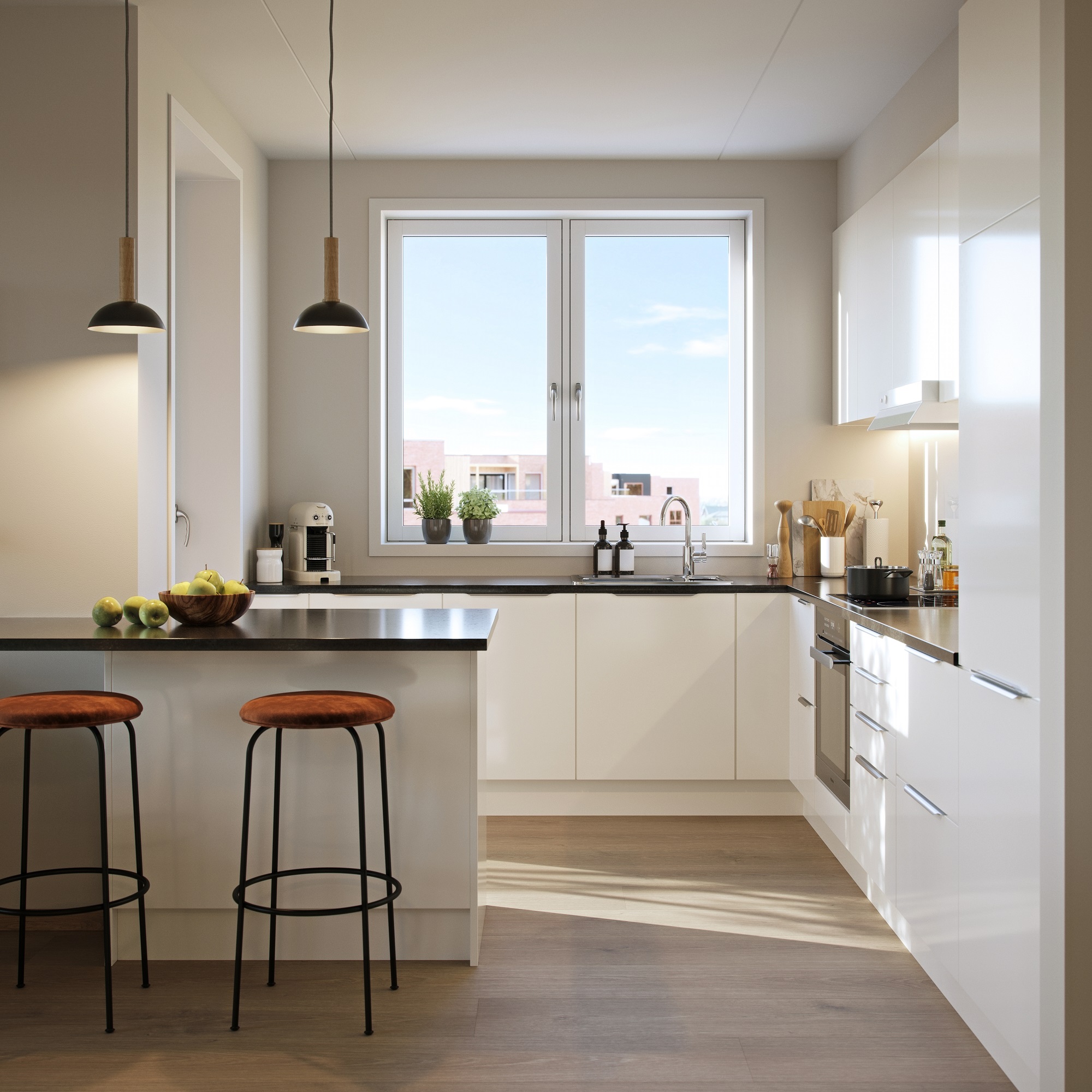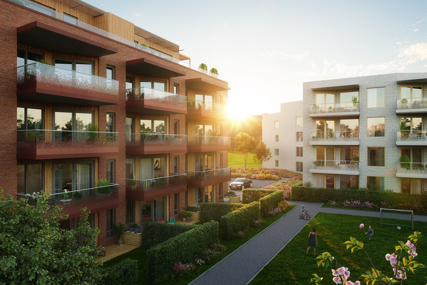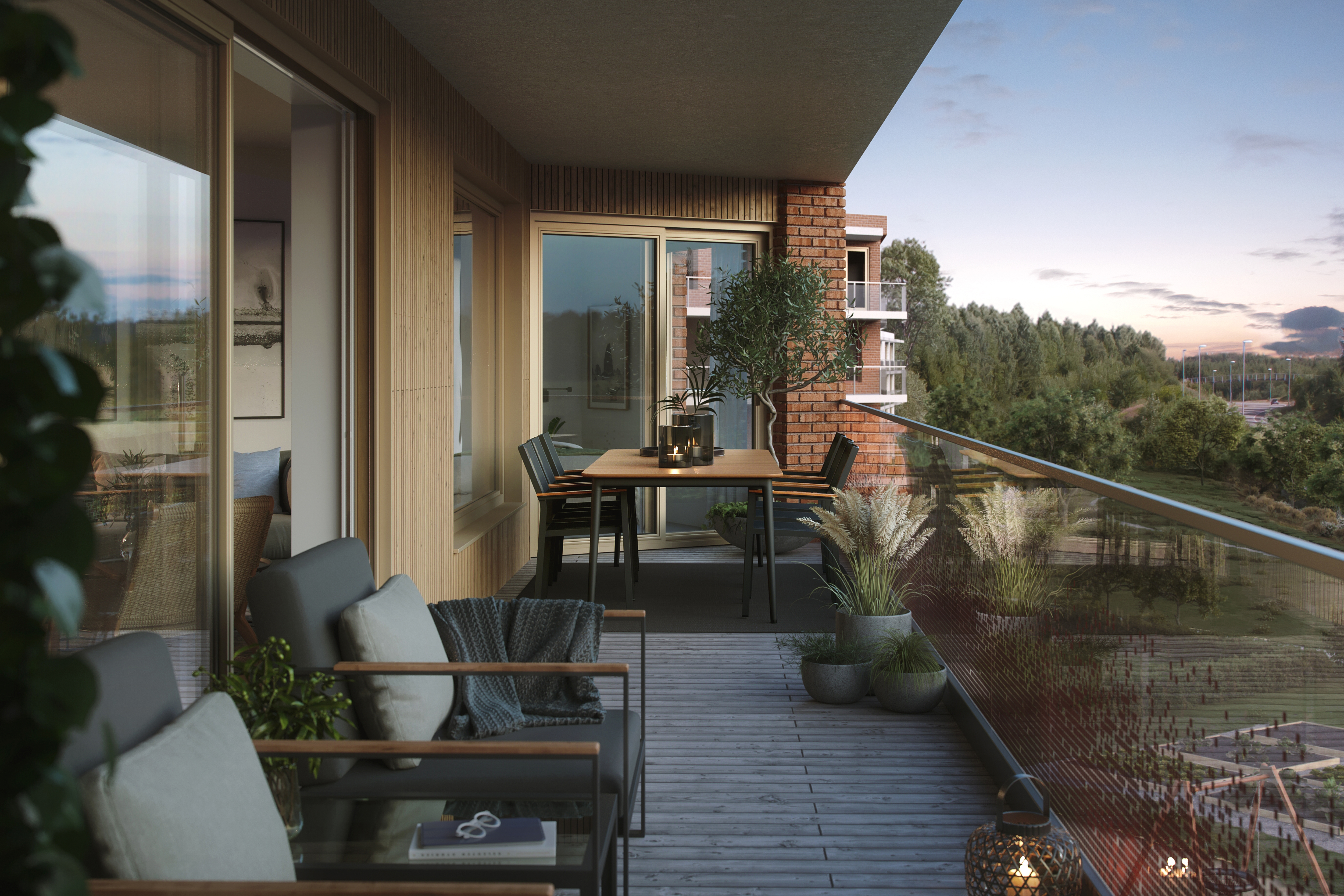 Alle illustrasjoner er utarbeidet basert på tegninger av fremtidige bygg. Illustrerte fasader vil kunne avvike fra ferdige bygg. Elementer og materialer i illustrasjonene kan avvike fra standardleveranse. Øvrige bygg, beplantning, vegetasjon og fellesarealer er ikke endelig prosjektert.