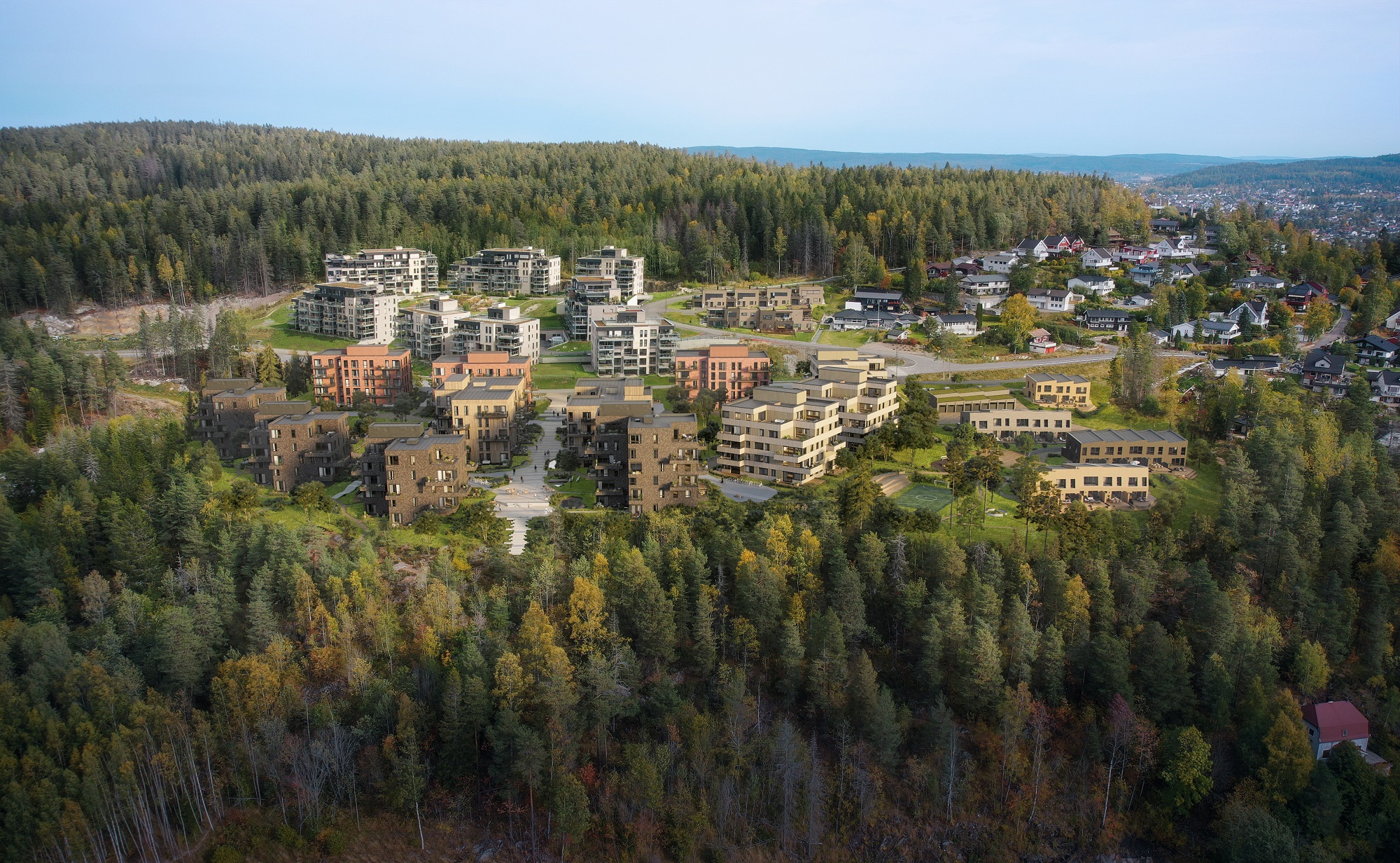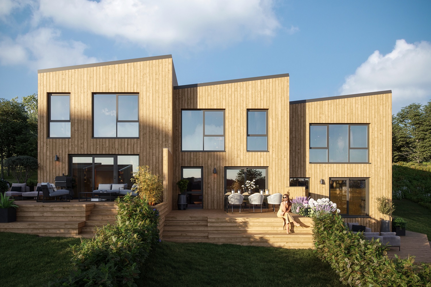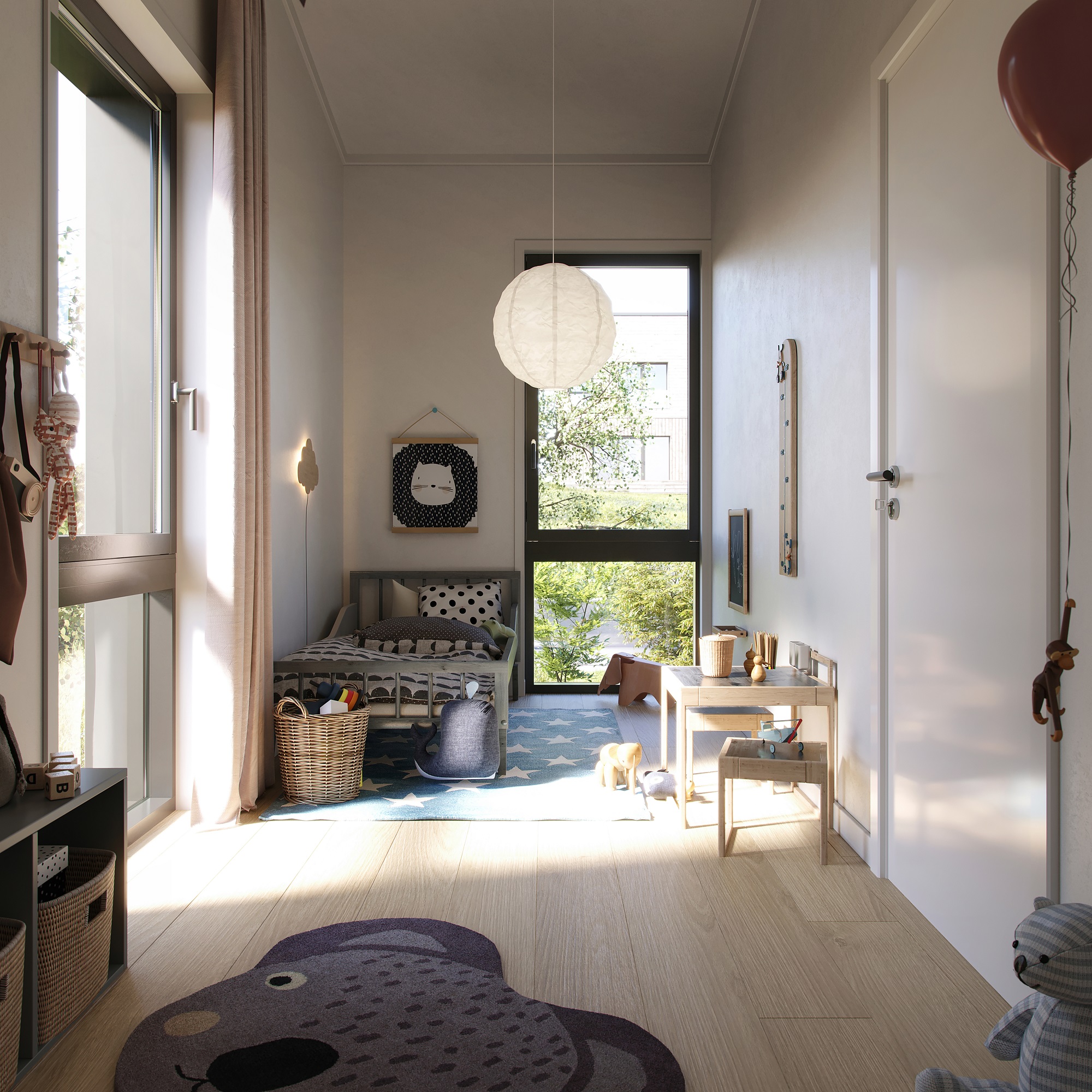 Alle illustrasjoner er utarbeidet basert på tegninger av fremtidige bygg. Illustrerte fasader vil kunne avvike fra ferdige bygg. Elementer og materialer i illustrasjonene kan avvike fra standardleveranse. Øvrige bygg, beplantning, vegetasjon og fellesarealer er ikke endelig prosjektert.