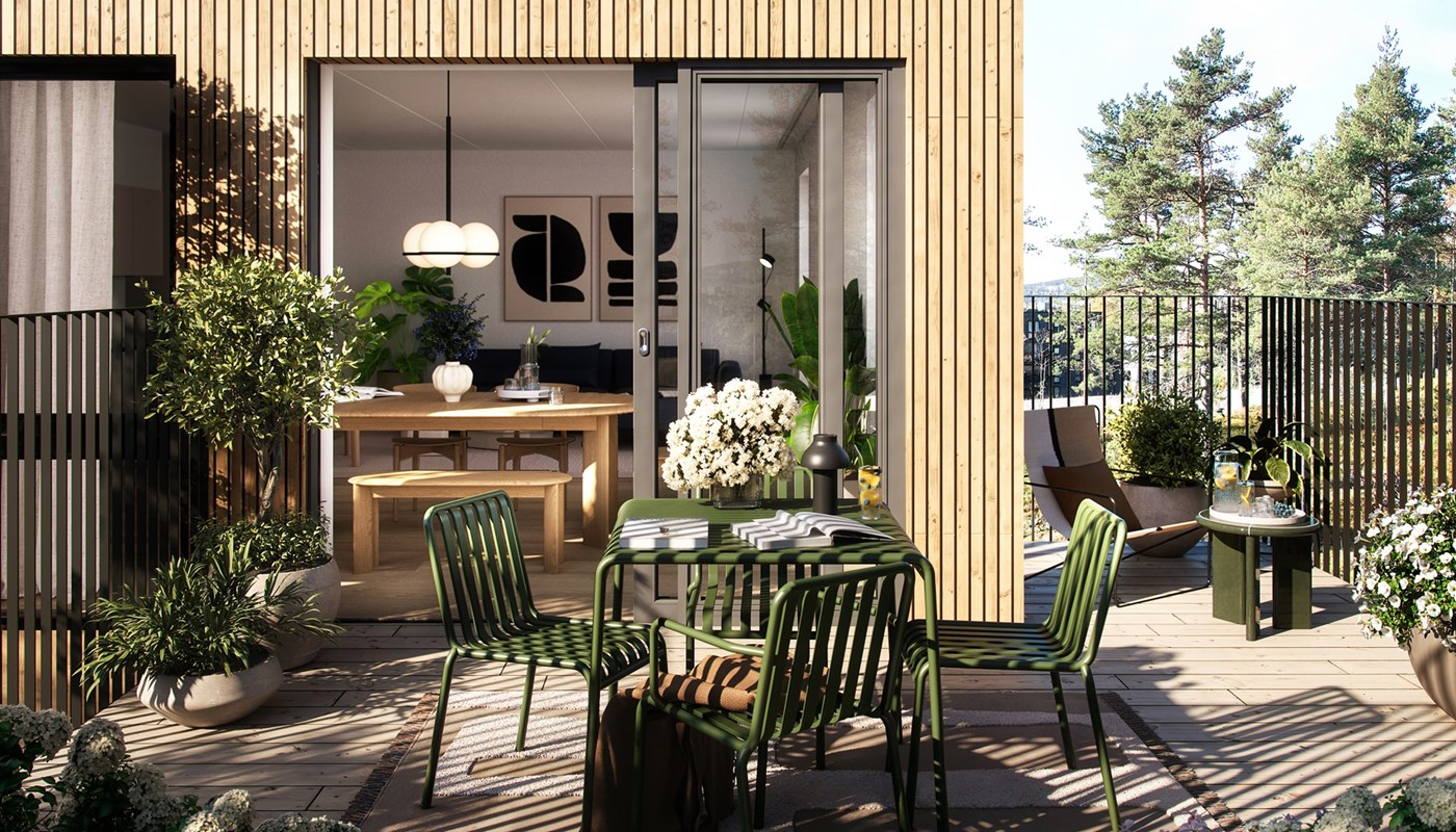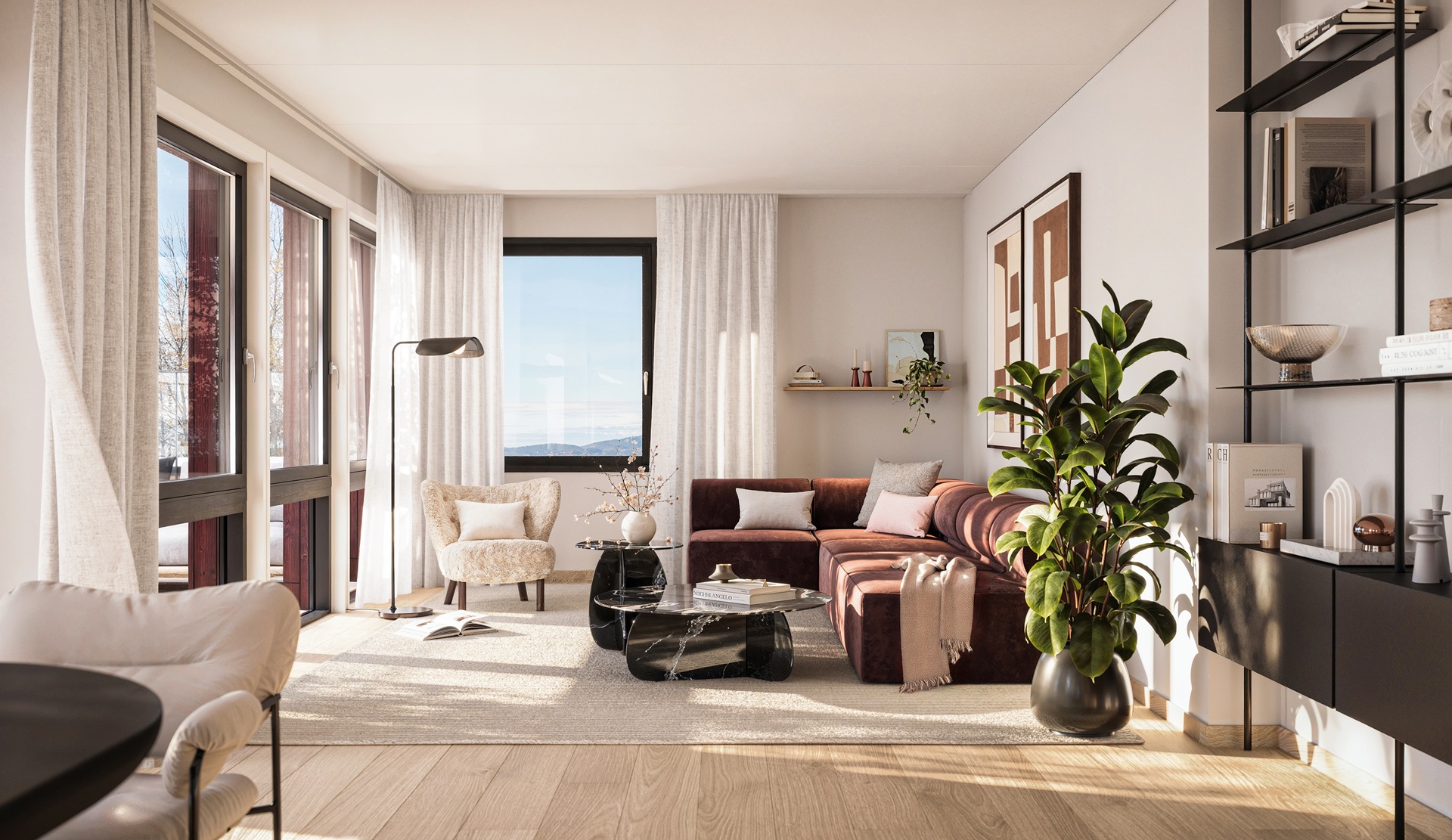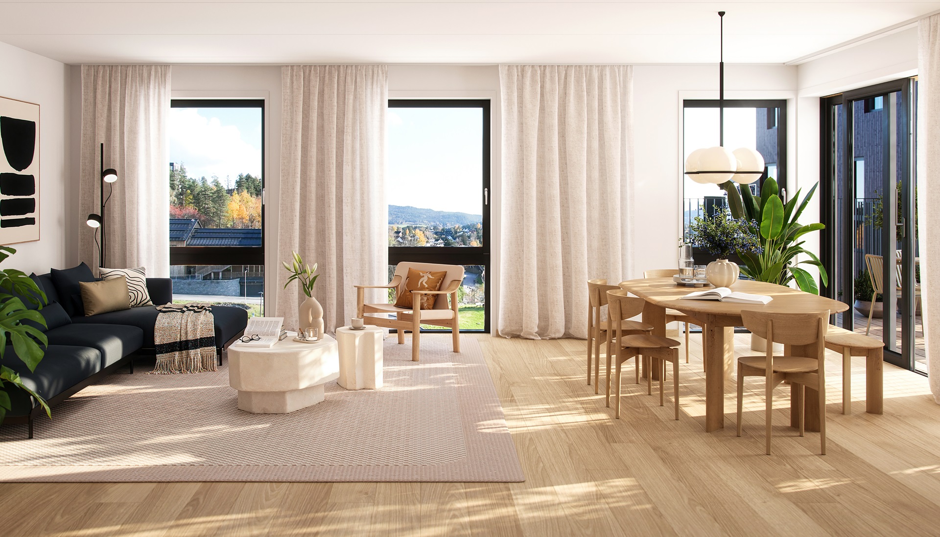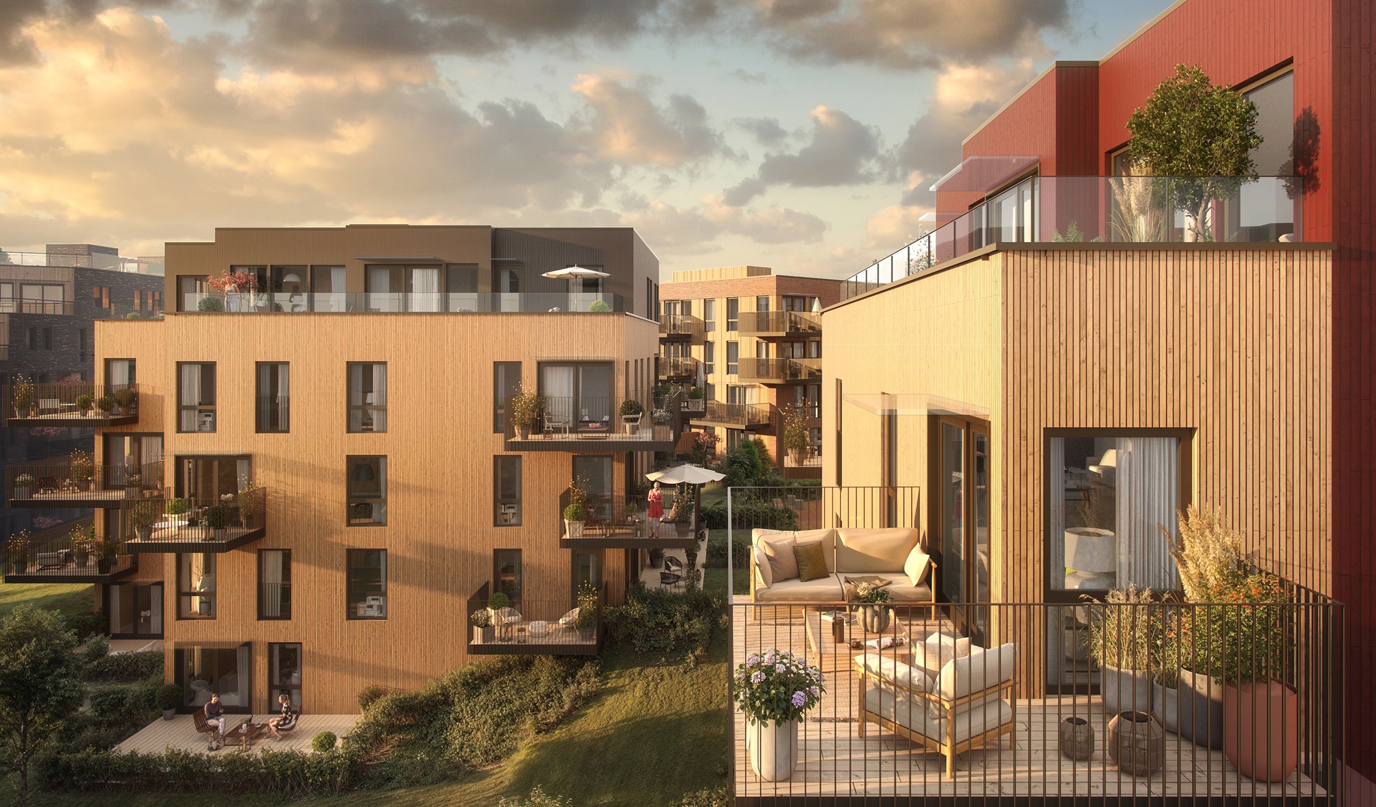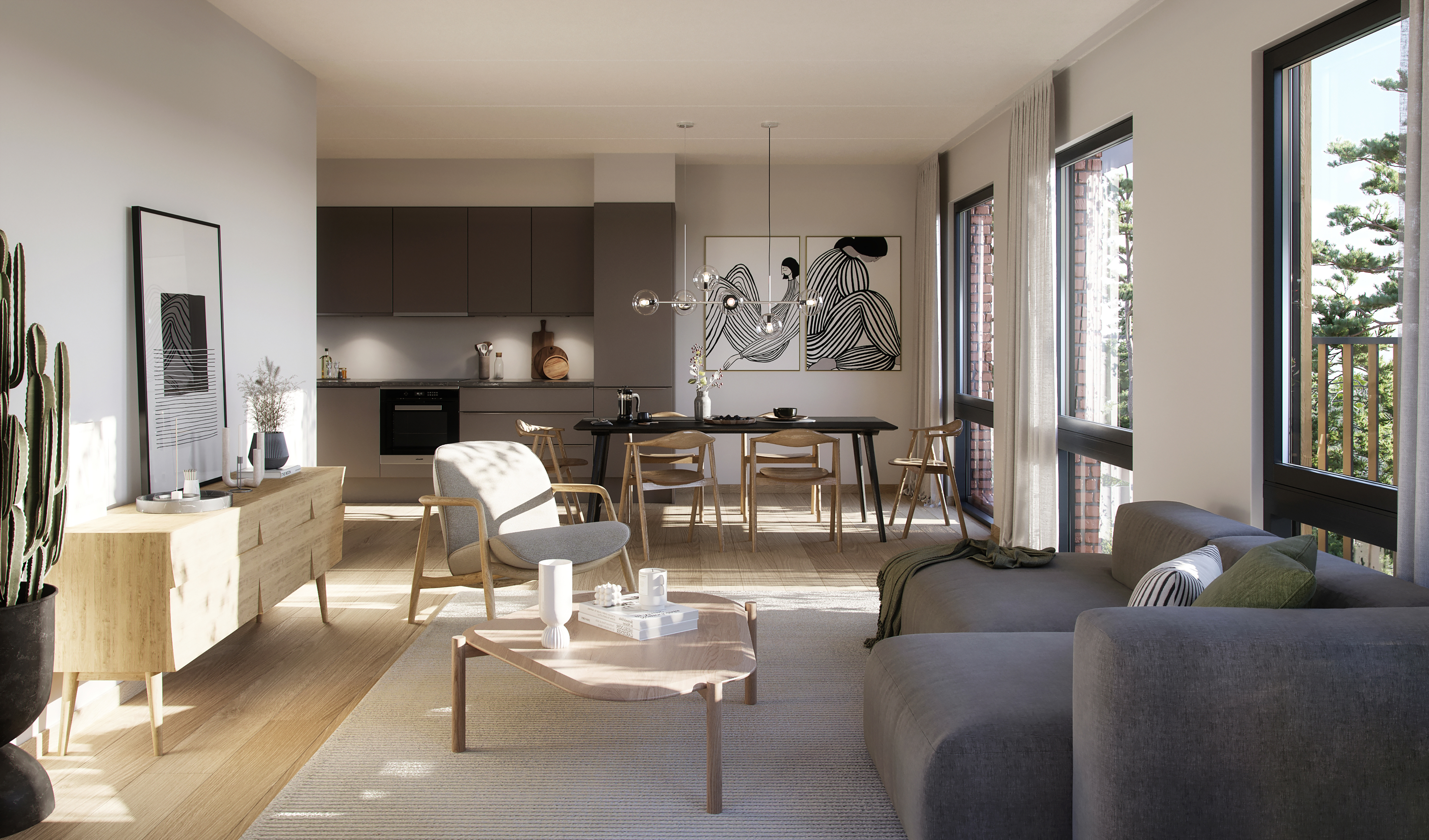 Alle illustrasjoner er utarbeidet basert på tegninger av fremtidige bygg. Illustrerte fasader vil kunne avvike fra ferdige bygg. Elementer og materialer i illustrasjonene kan avvike fra standardleveranse. Øvrige bygg, beplantning, vegetasjon og fellesarealer er ikke endelig prosjektert.