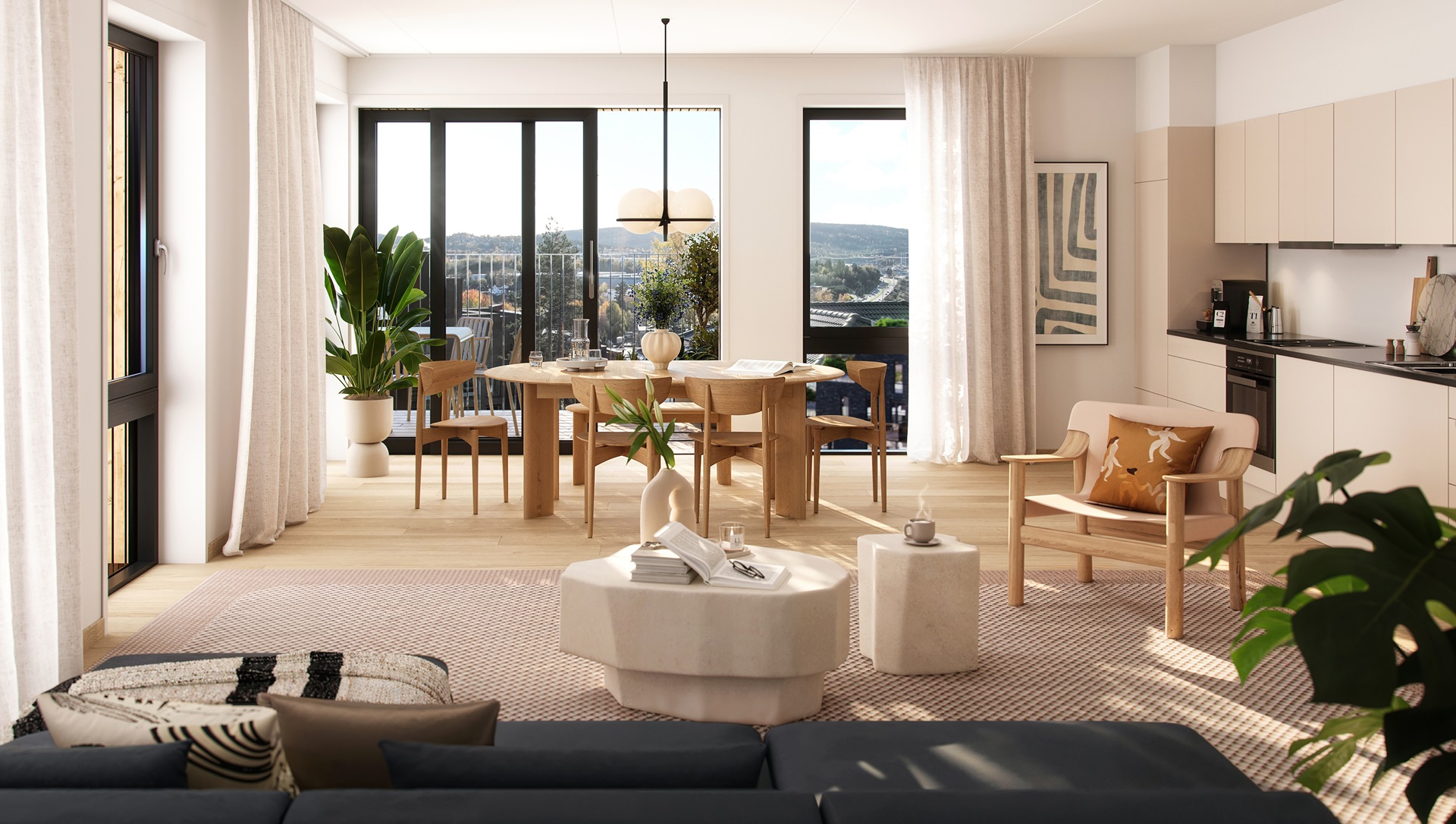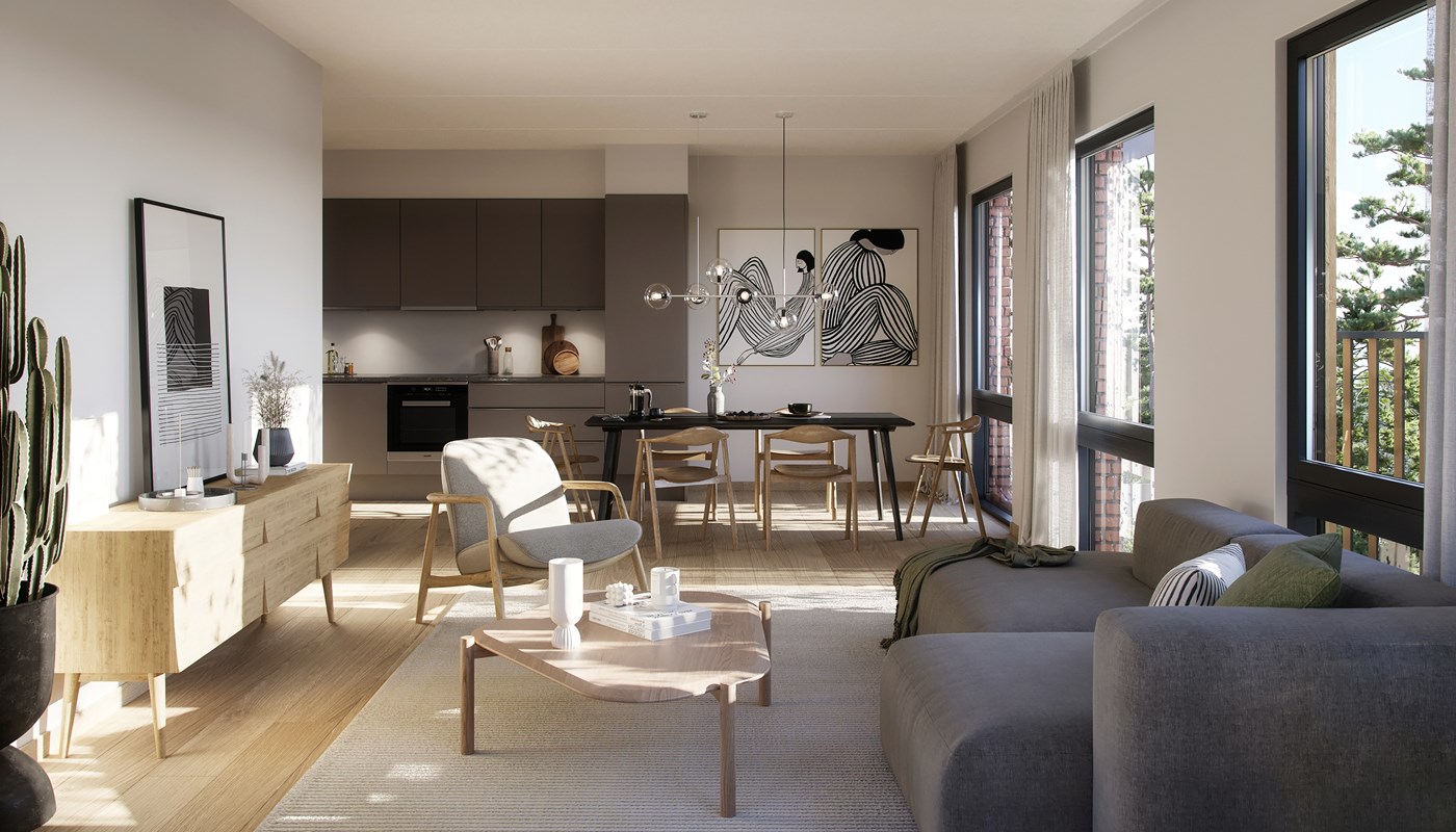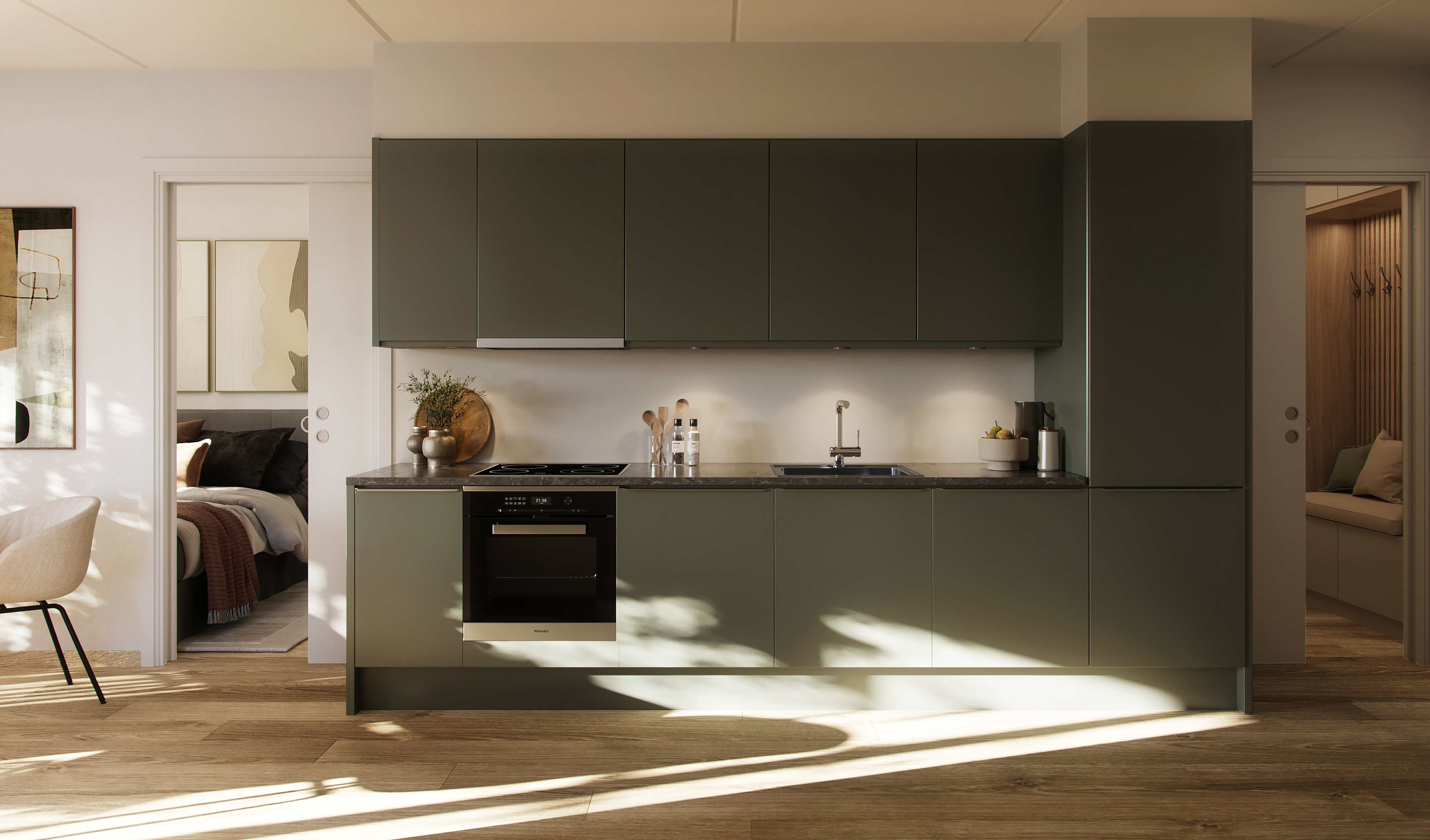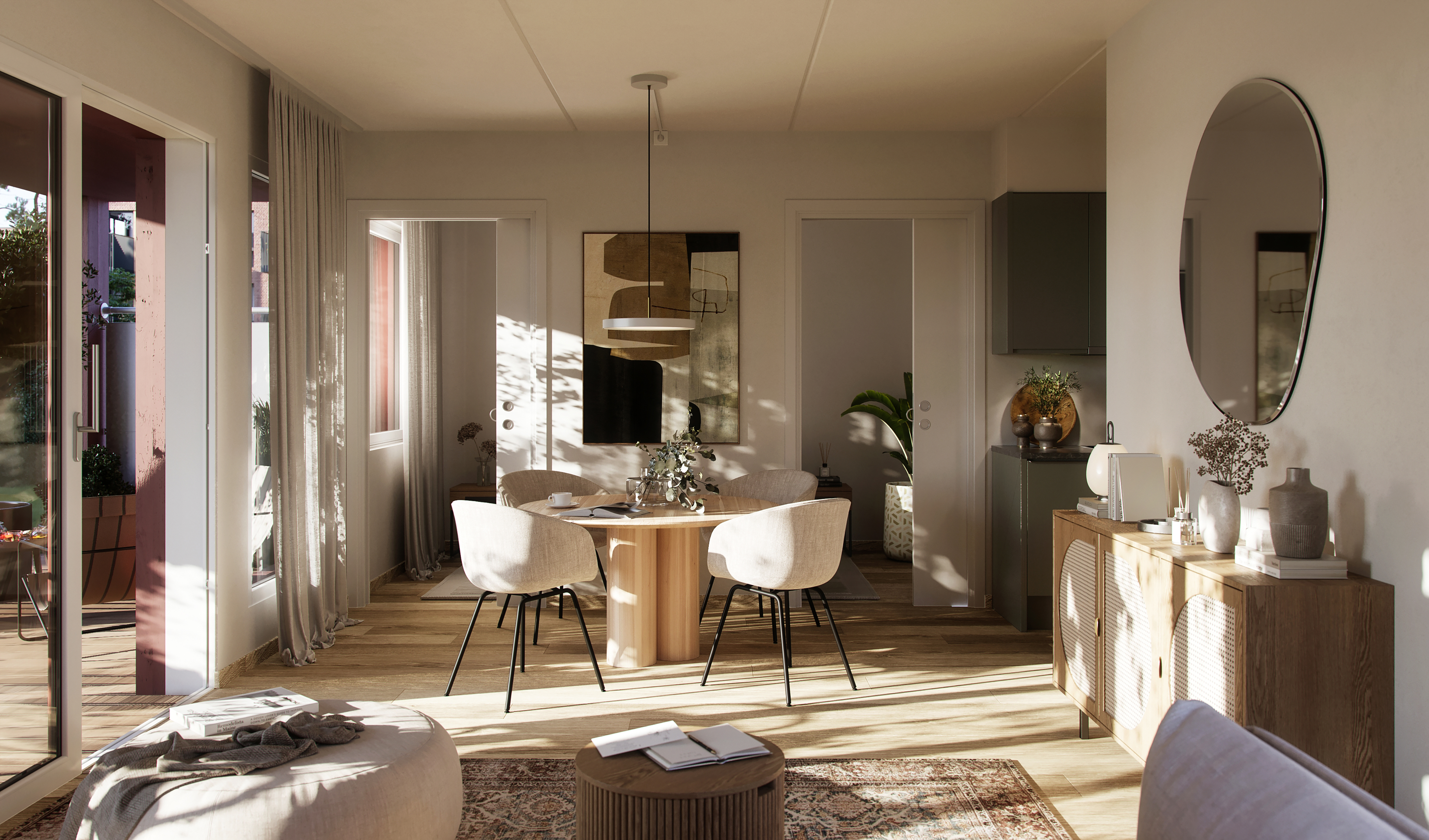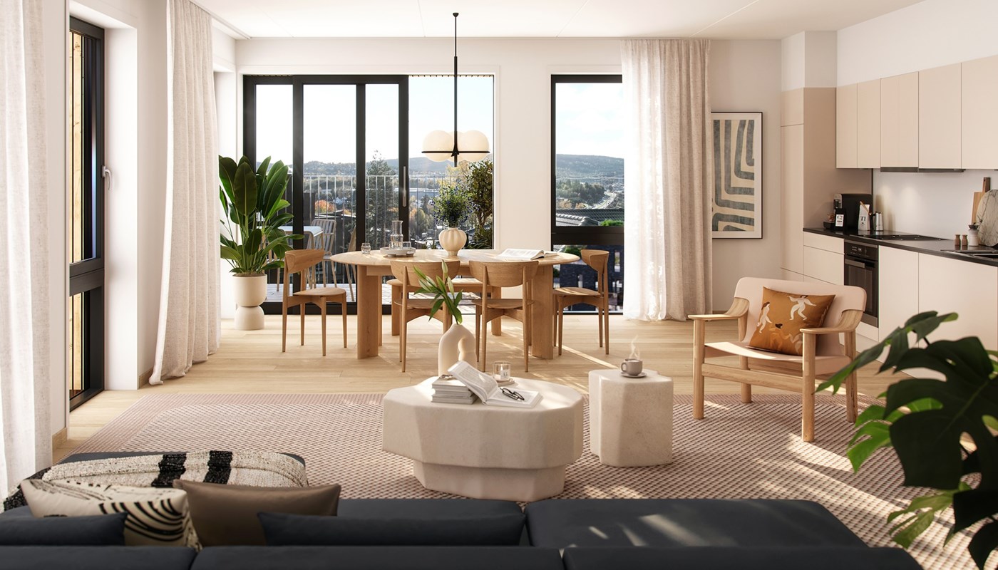Alle illustrasjoner er utarbeidet basert på tegninger av fremtidige bygg. Illustrerte fasader vil kunne avvike fra ferdige bygg. Elementer og materialer i illustrasjonene kan avvike fra standardleveranse. Øvrige bygg, beplantning, vegetasjon og fellesarealer er ikke endelig prosjektert.