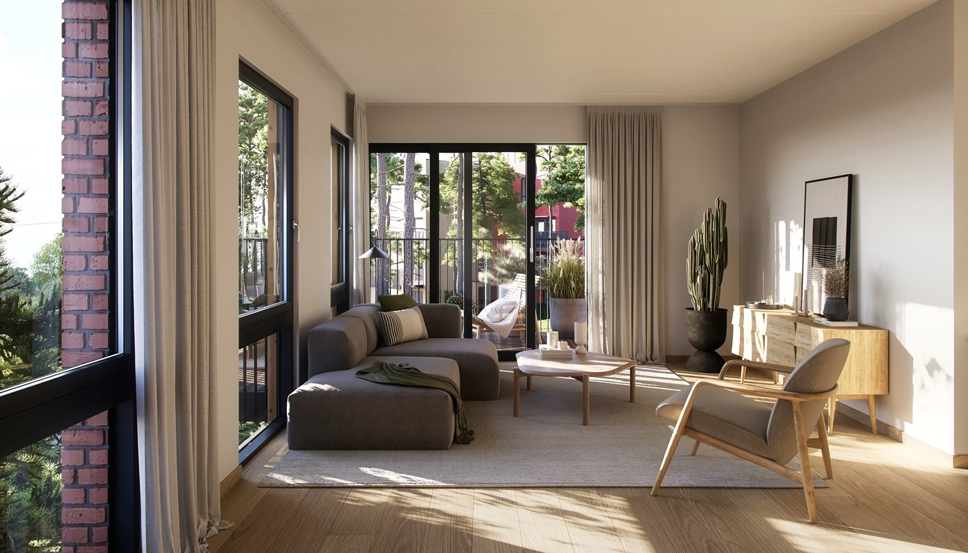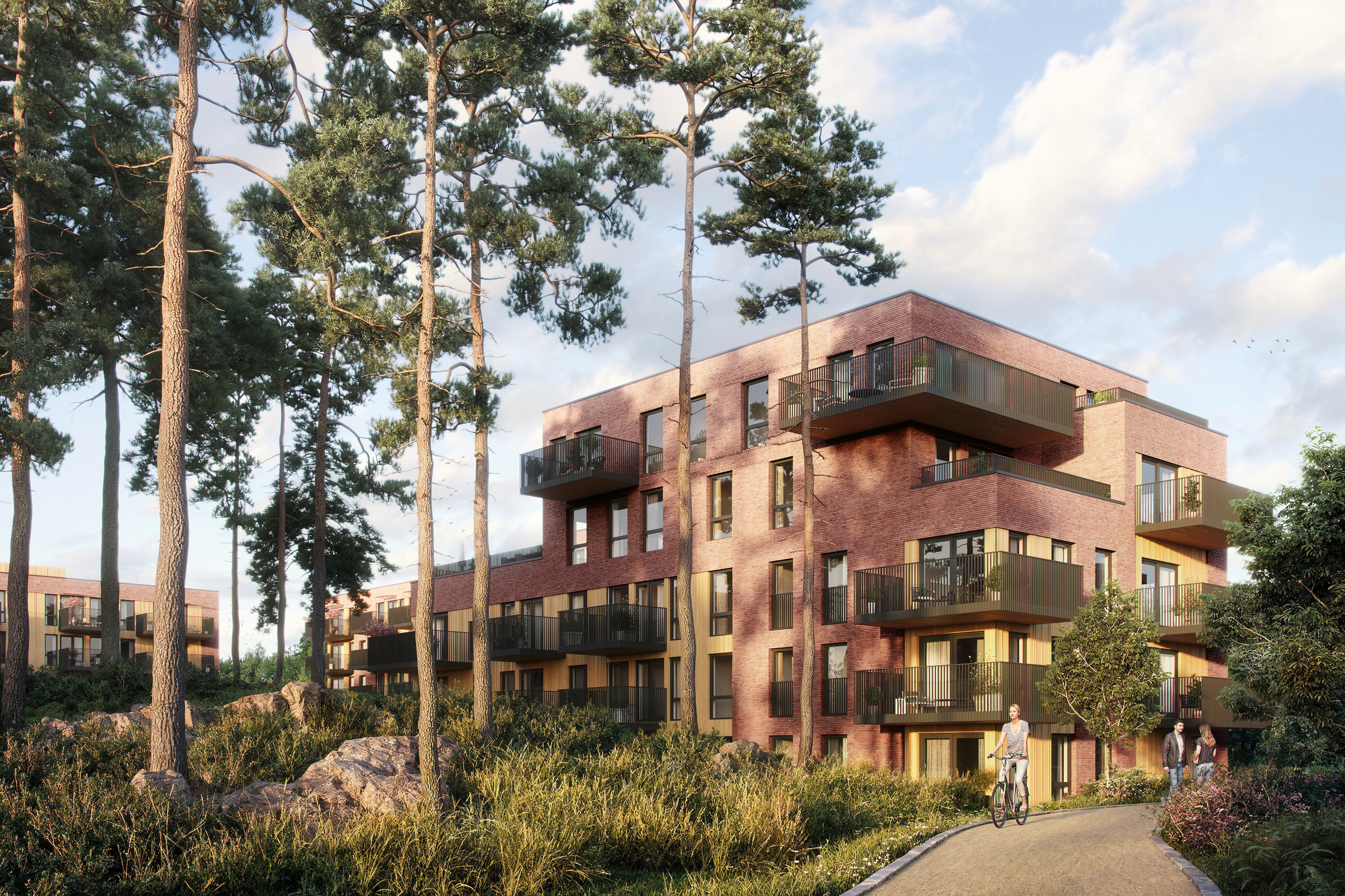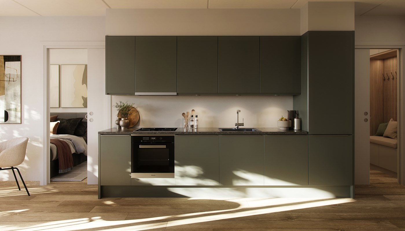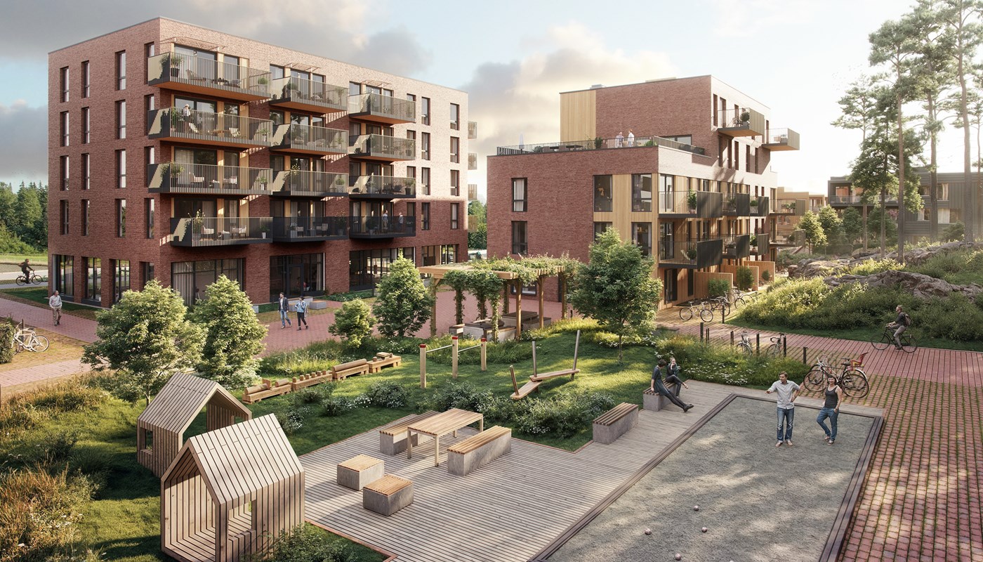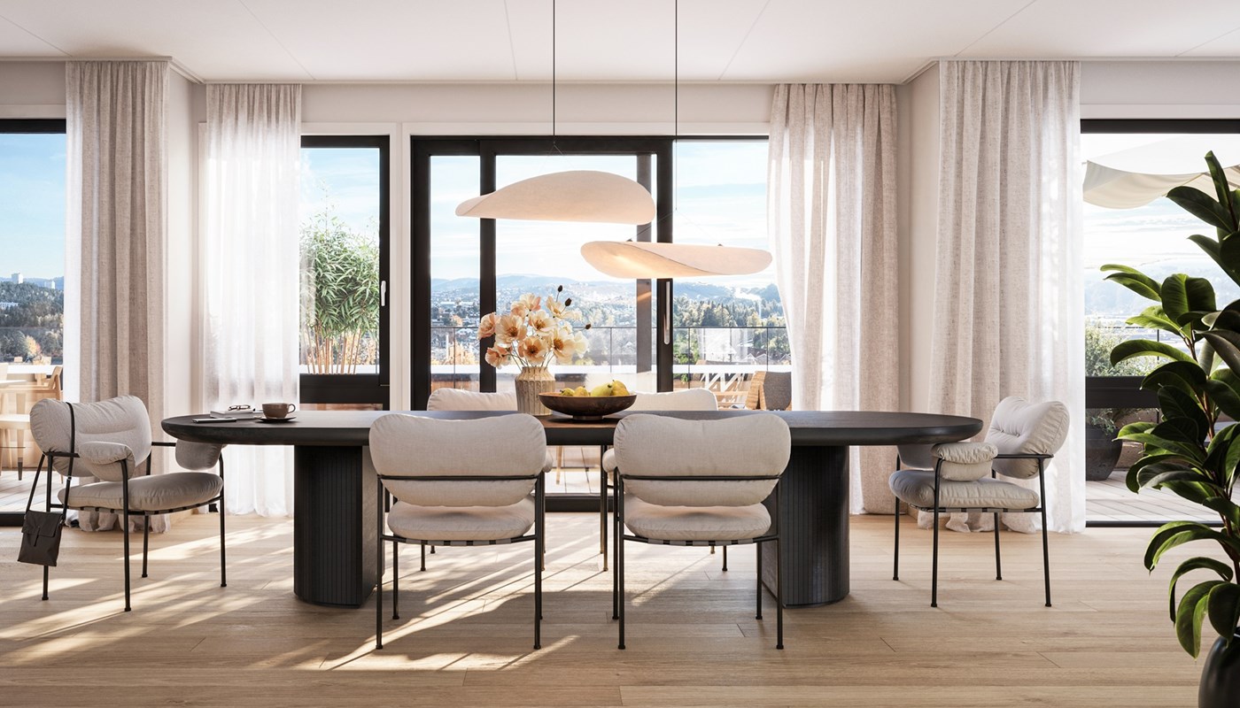 Alle illustrasjoner er utarbeidet basert på tegninger av fremtidige bygg. Illustrerte fasader vil kunne avvike fra ferdige bygg. Elementer og materialer i illustrasjonene kan avvike fra standardleveranse. Øvrige bygg, beplantning, vegetasjon og fellesarealer er ikke endelig prosjektert.