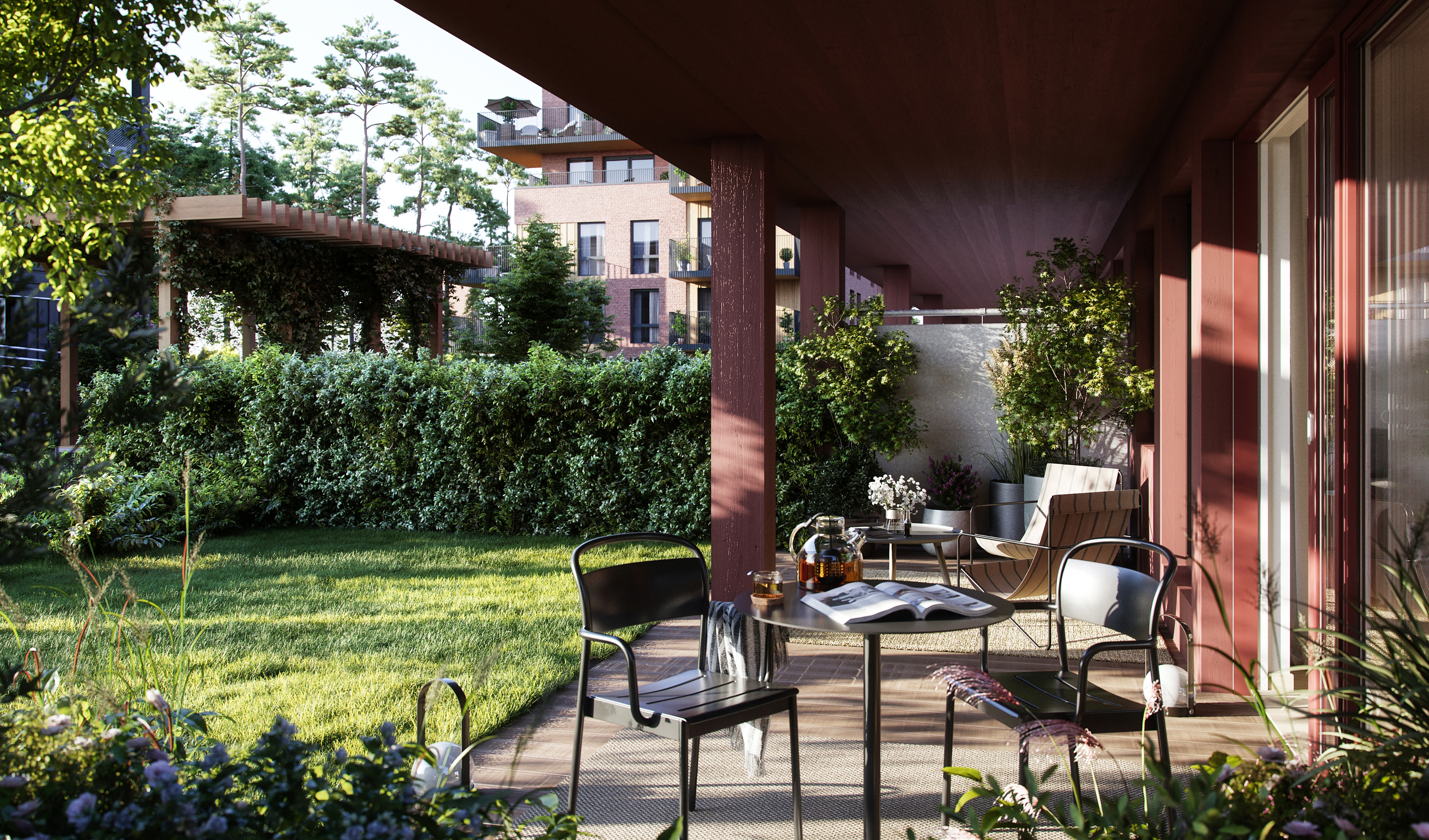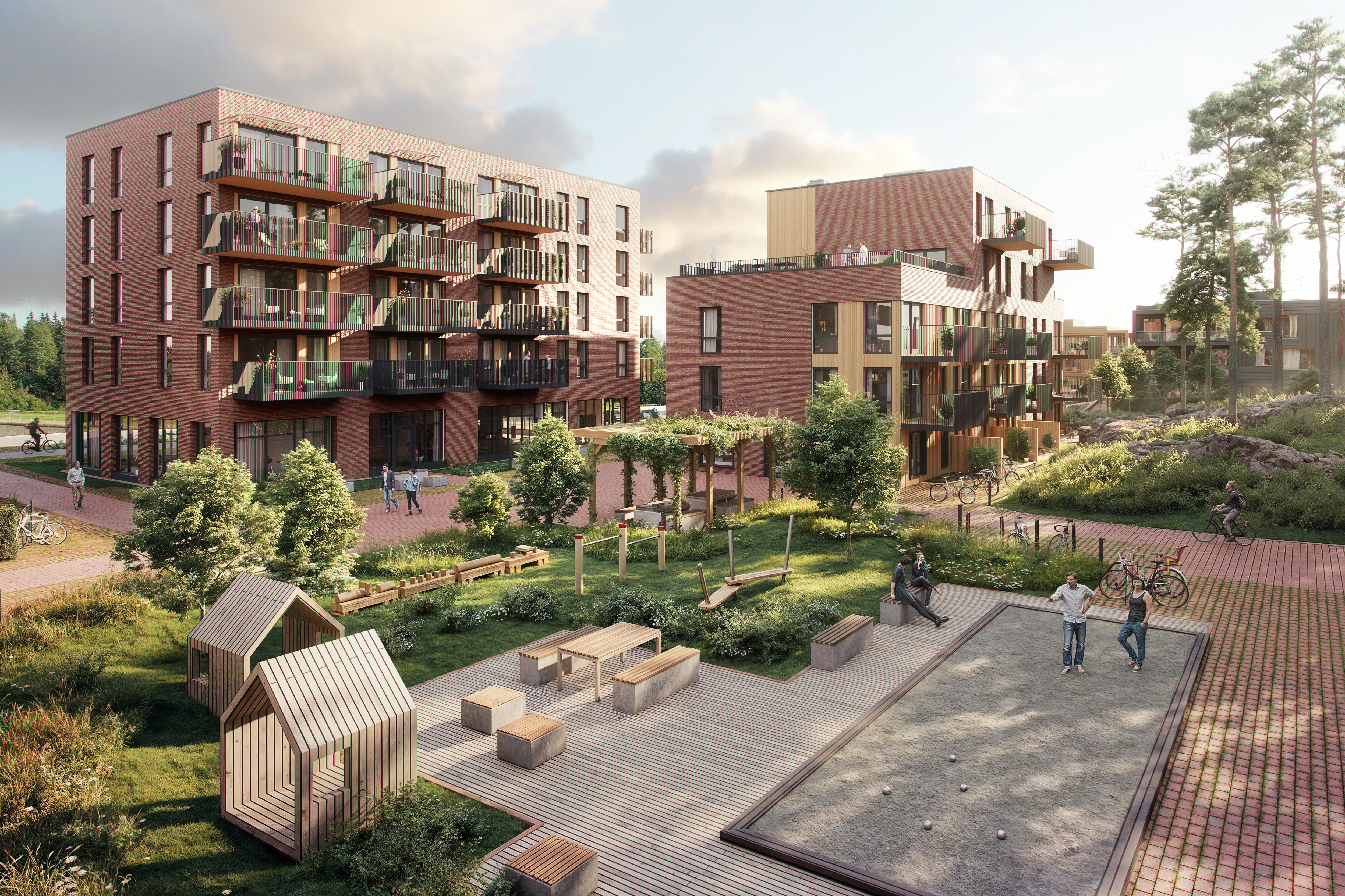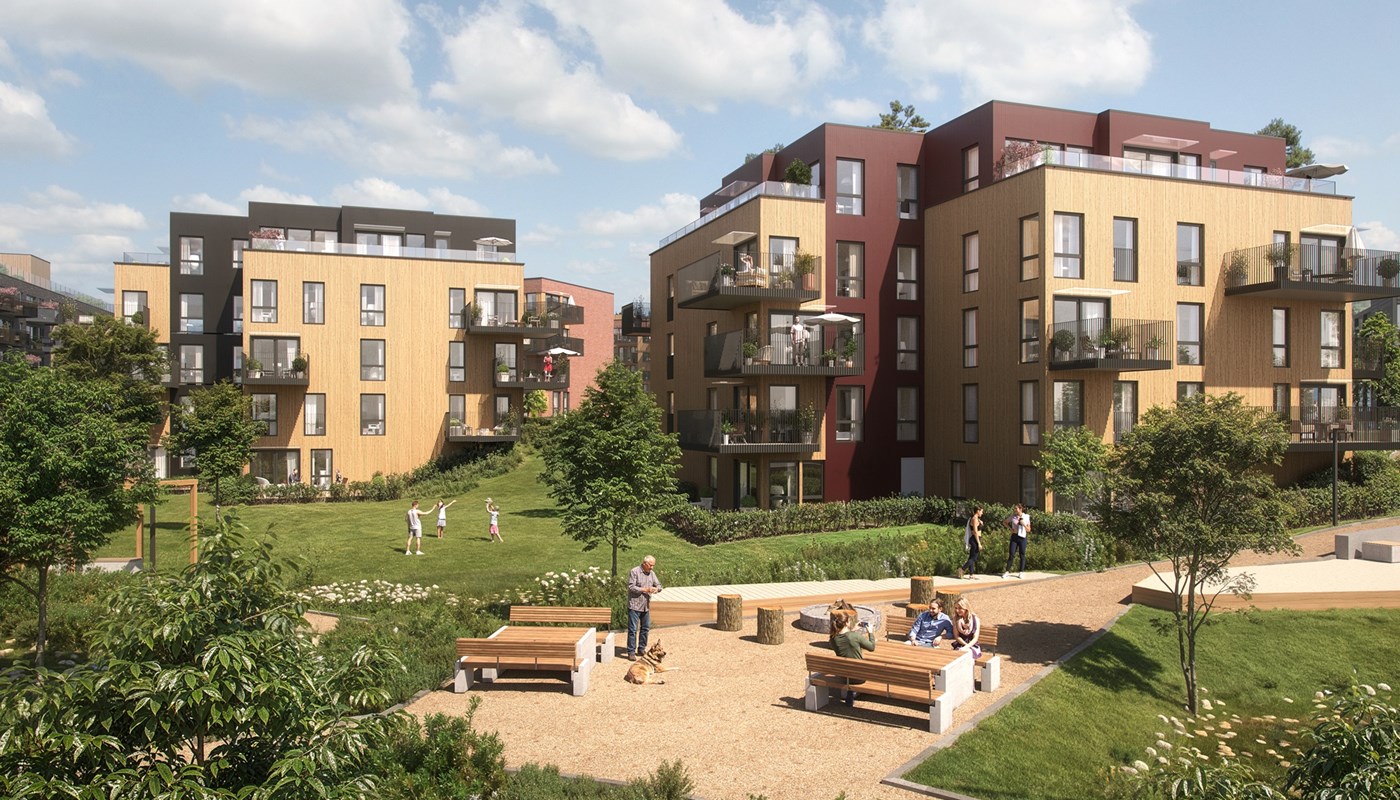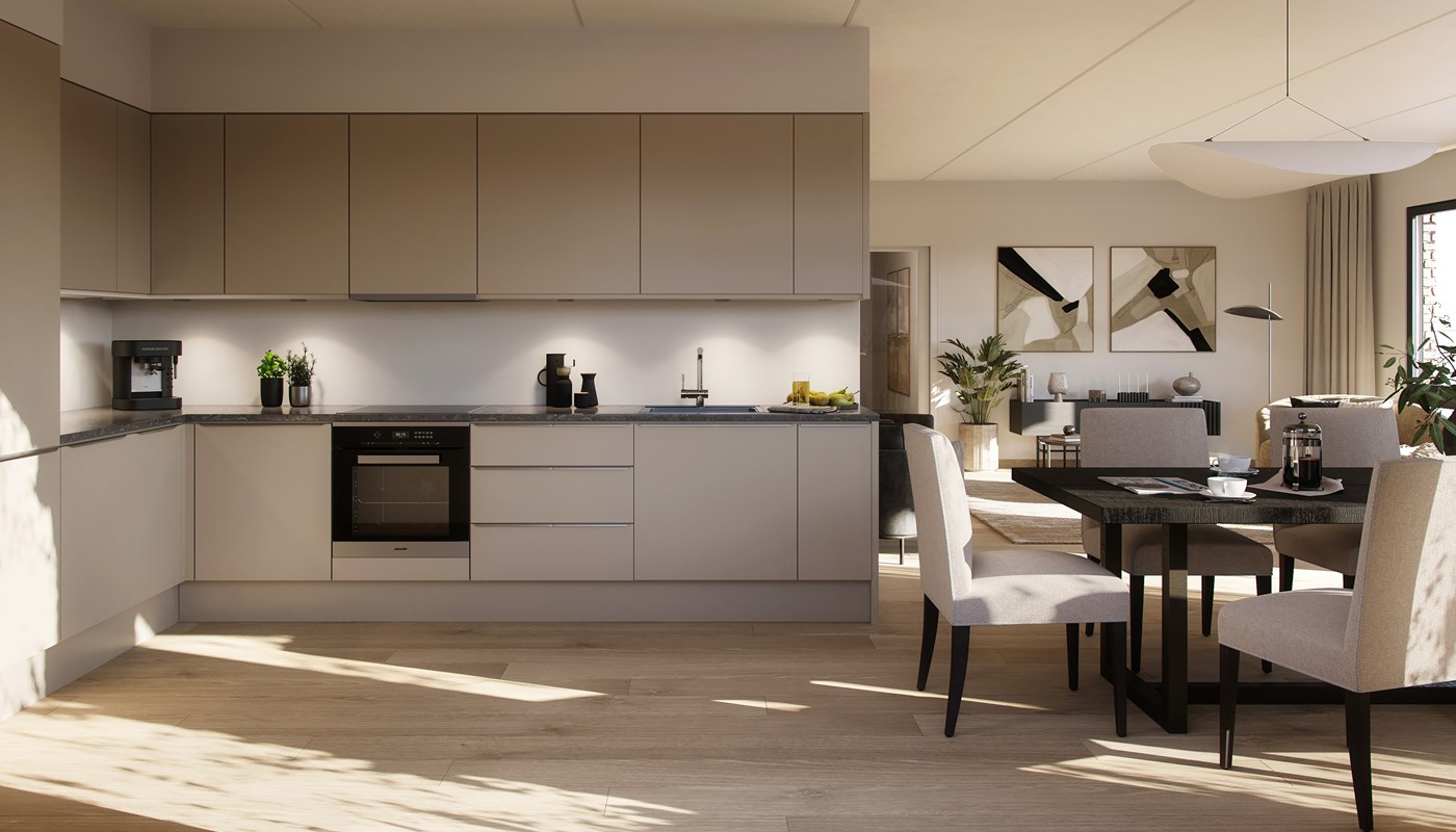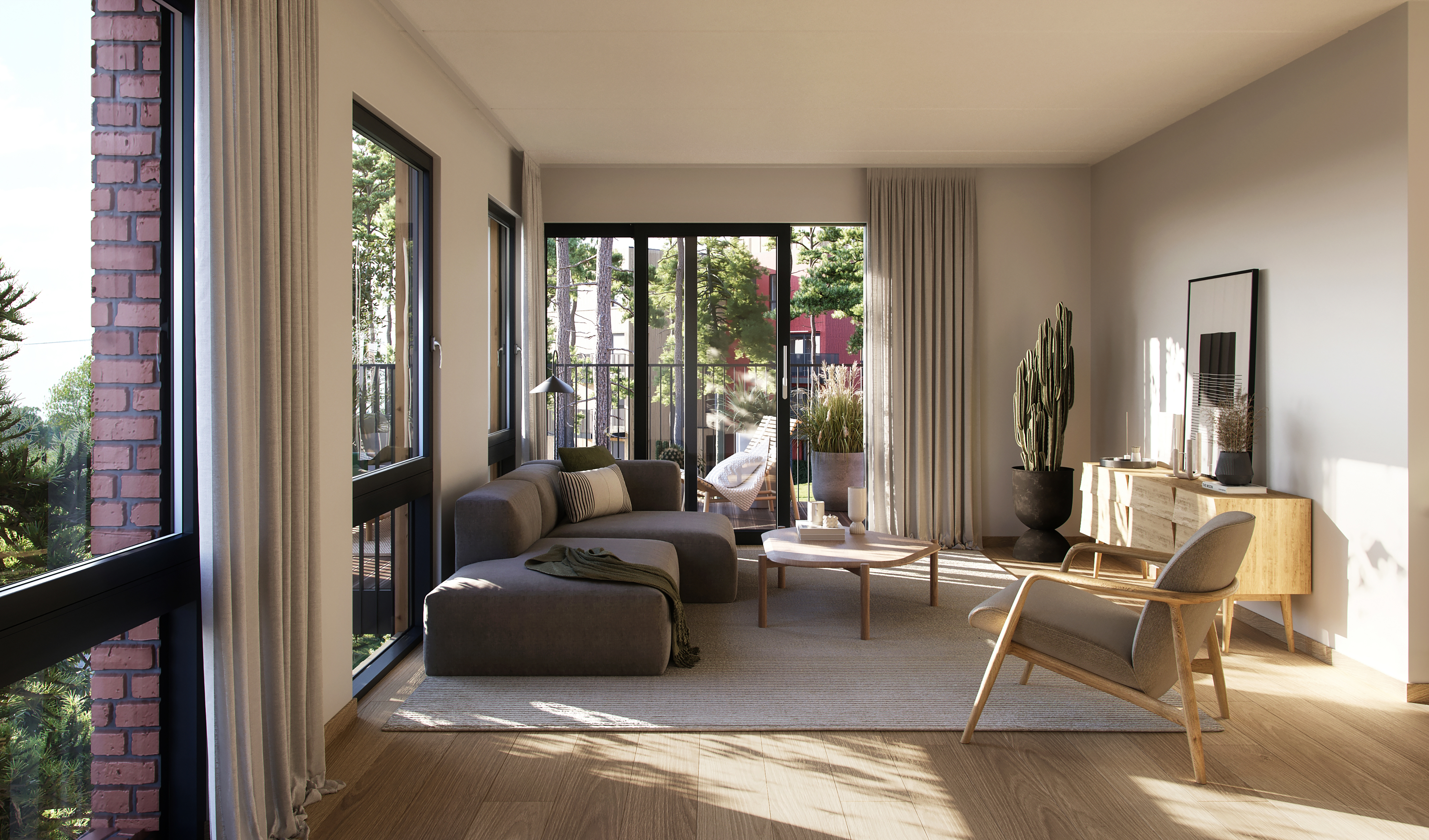 Alle illustrasjoner er utarbeidet basert på tegninger av fremtidige bygg. Illustrerte fasader vil kunne avvike fra ferdige bygg. Elementer og materialer i illustrasjonene kan avvike fra standardleveranse. Øvrige bygg, beplantning, vegetasjon og fellesarealer er ikke endelig prosjektert.