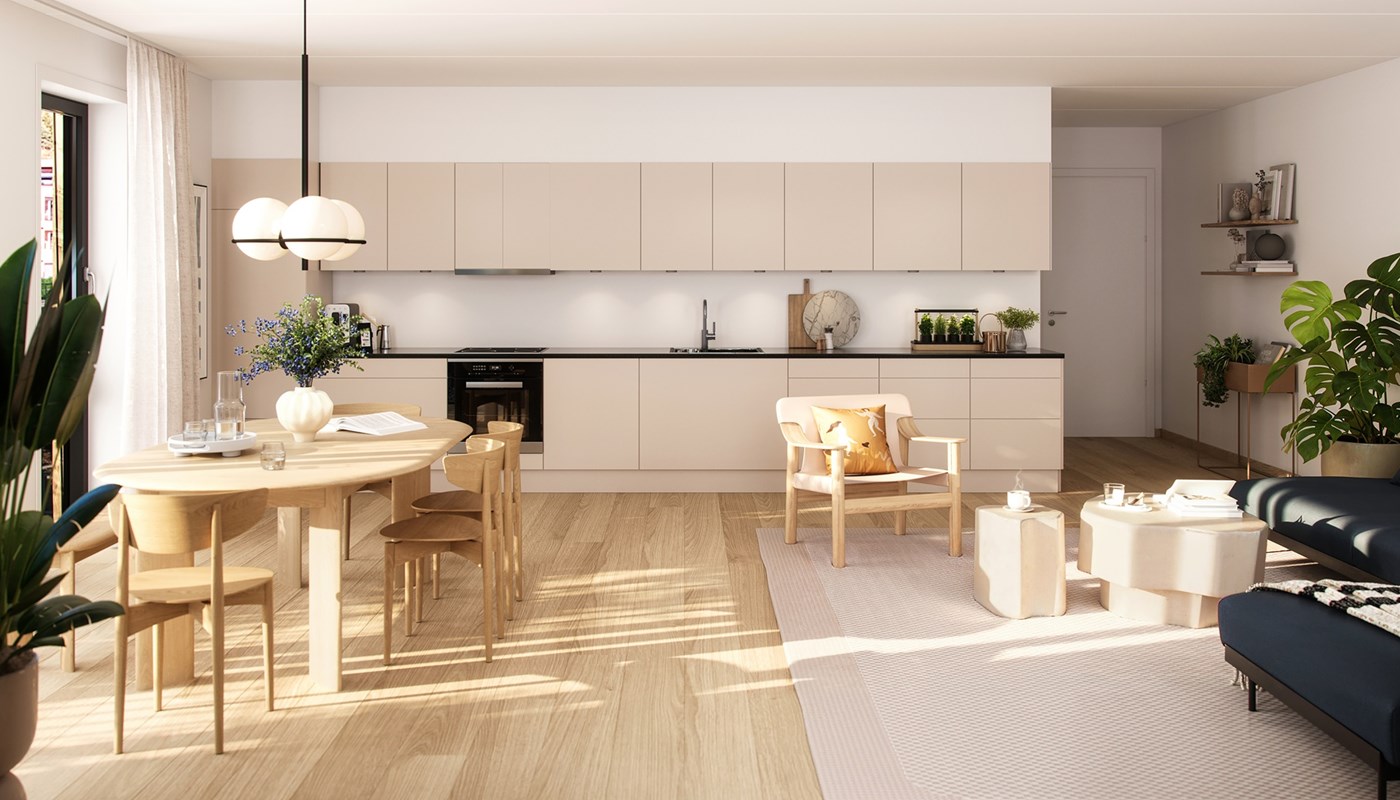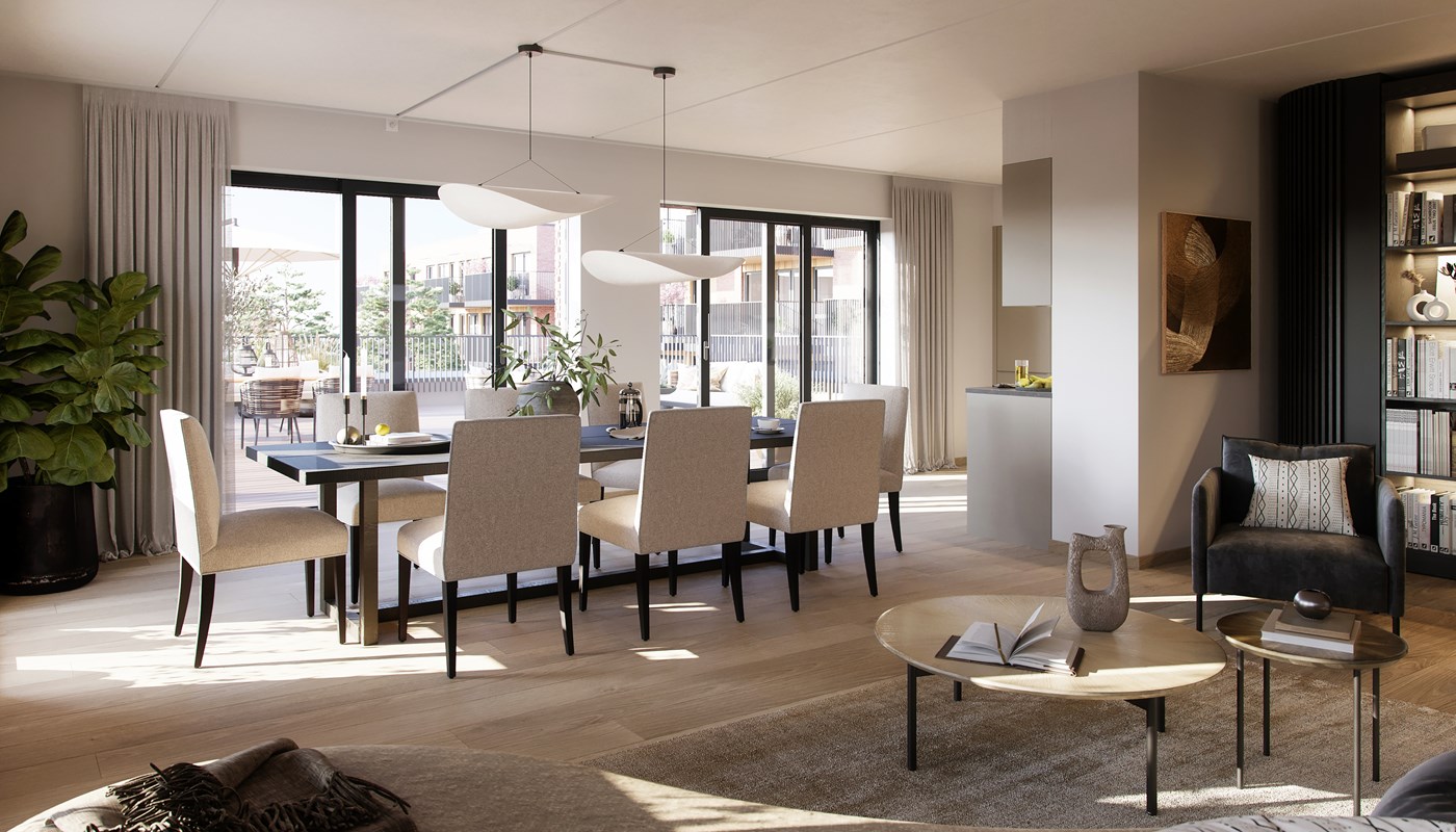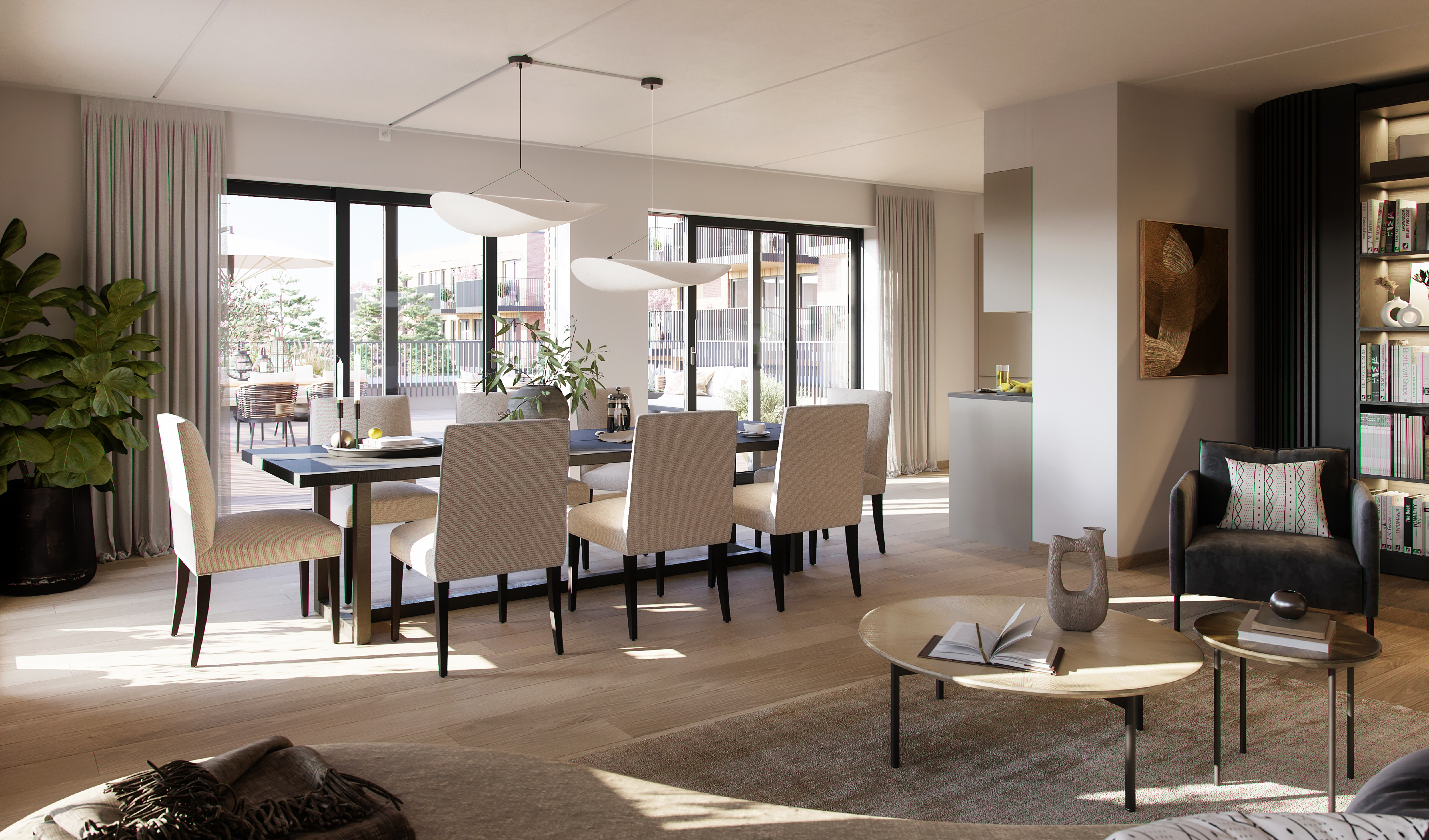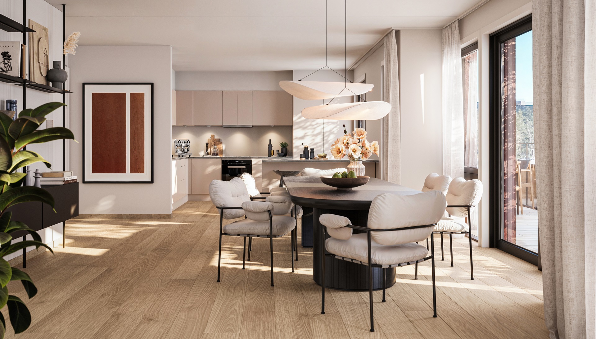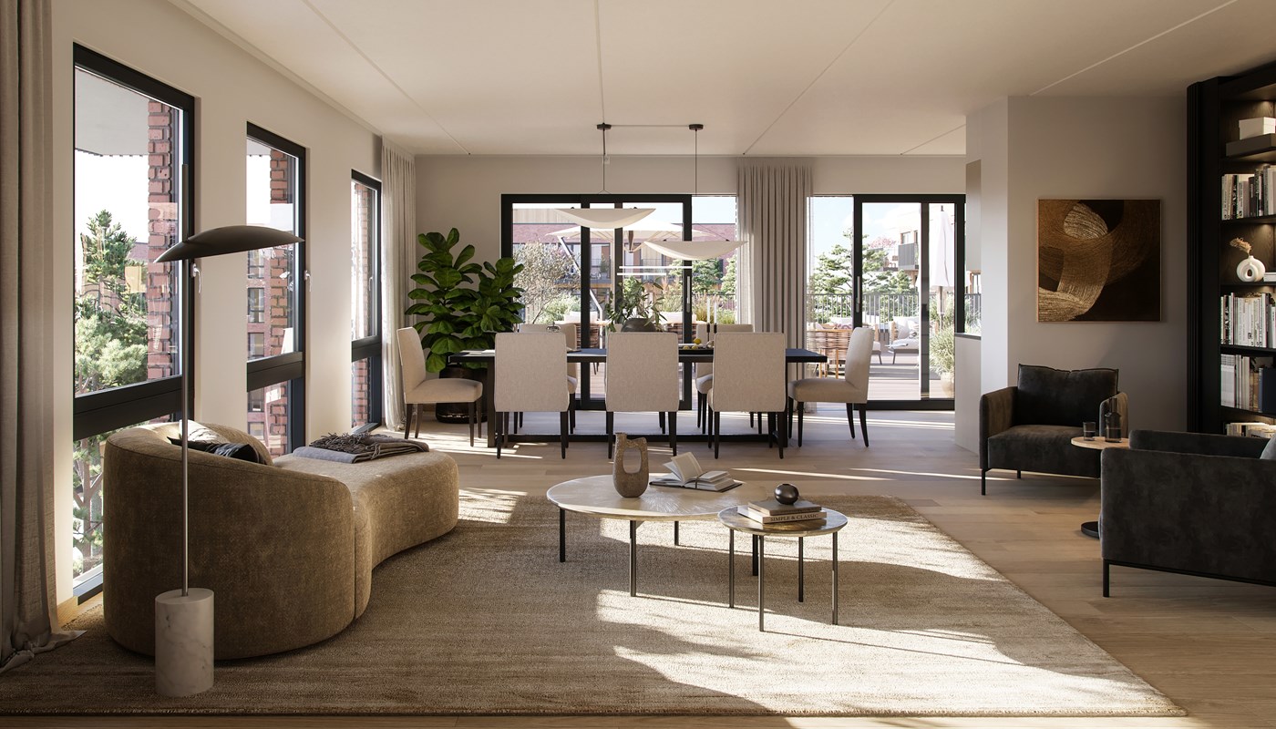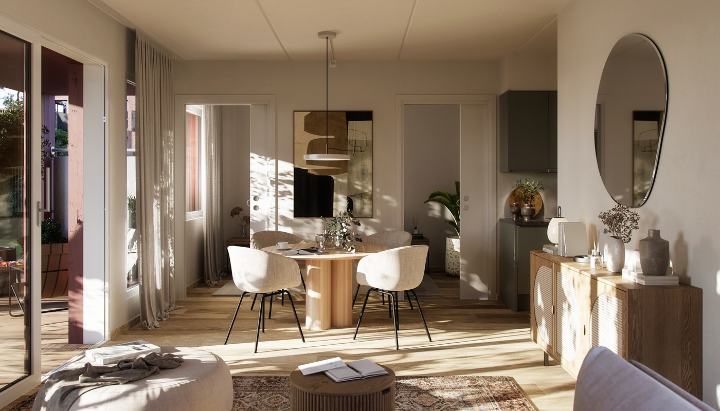 Alle illustrasjoner er utarbeidet basert på tegninger av fremtidige bygg. Illustrerte fasader vil kunne avvike fra ferdige bygg. Elementer og materialer i illustrasjonene kan avvike fra standardleveranse. Øvrige bygg, beplantning, vegetasjon og fellesarealer er ikke endelig prosjektert.