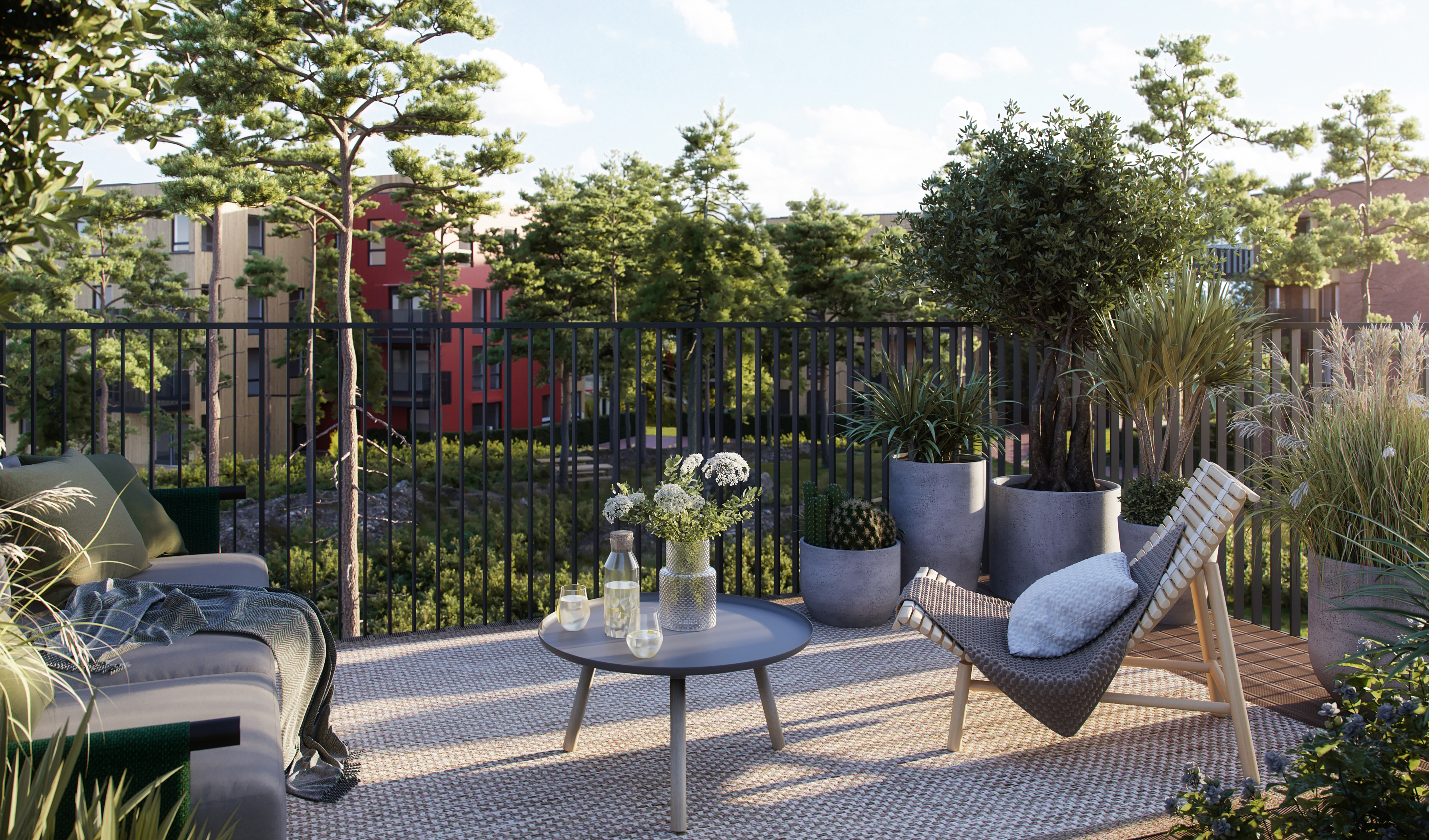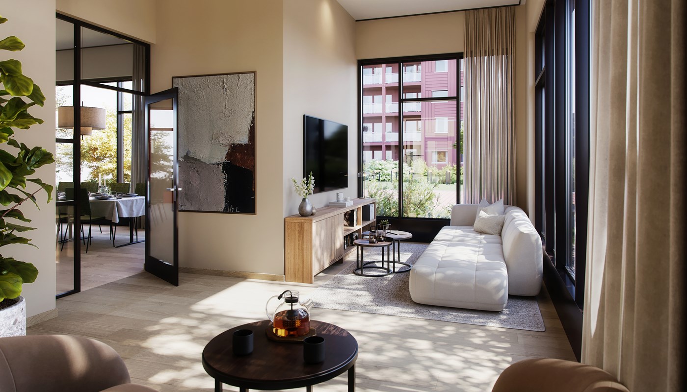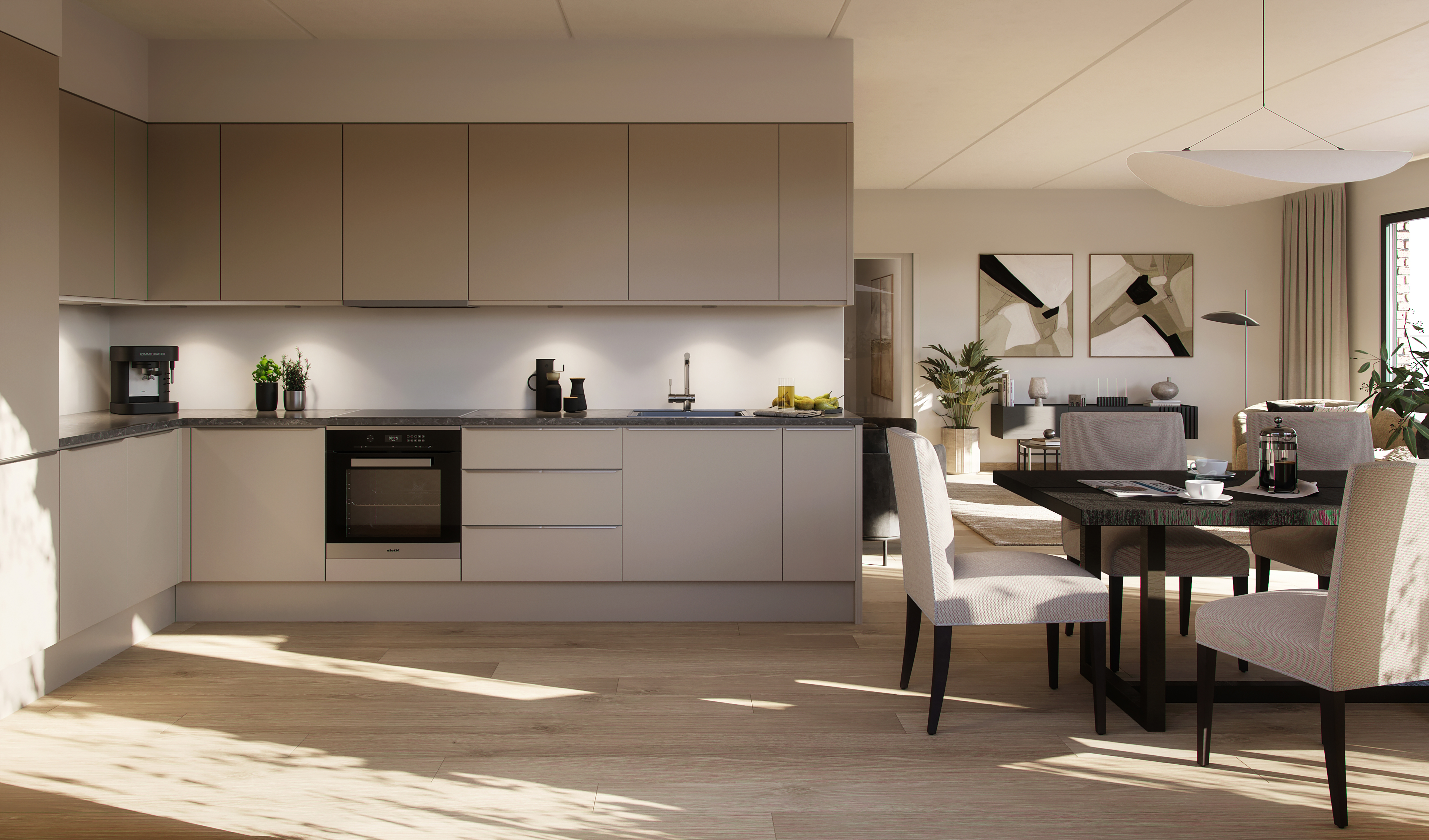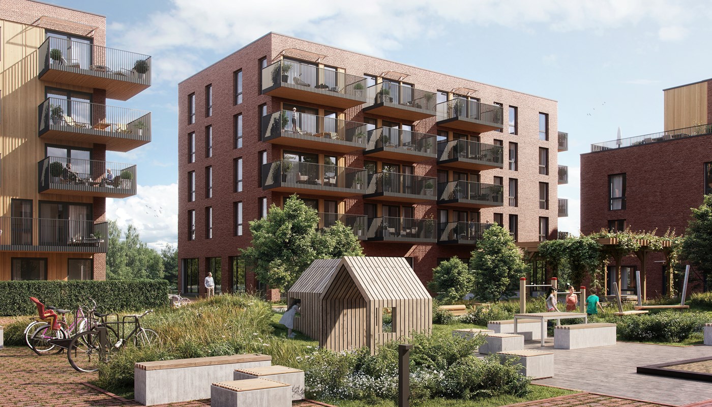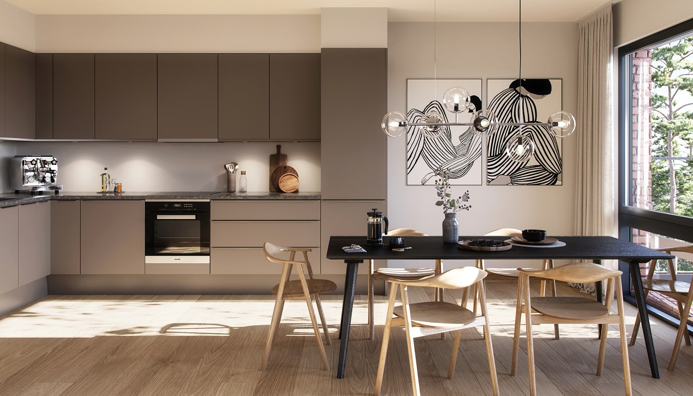 Alle illustrasjoner er utarbeidet basert på tegninger av fremtidige bygg. Illustrerte fasader vil kunne avvike fra ferdige bygg. Elementer og materialer i illustrasjonene kan avvike fra standardleveranse. Øvrige bygg, beplantning, vegetasjon og fellesarealer er ikke endelig prosjektert.