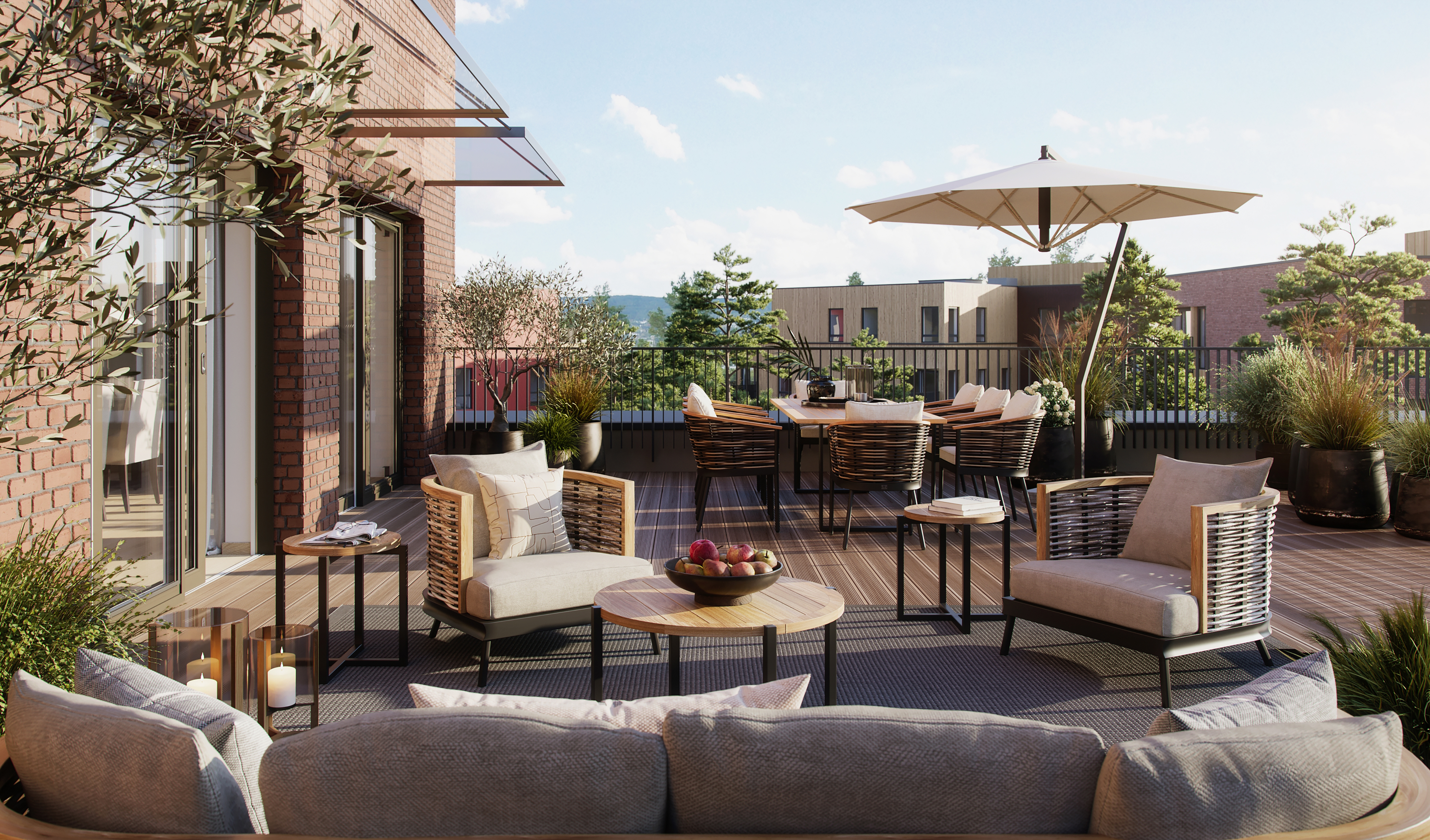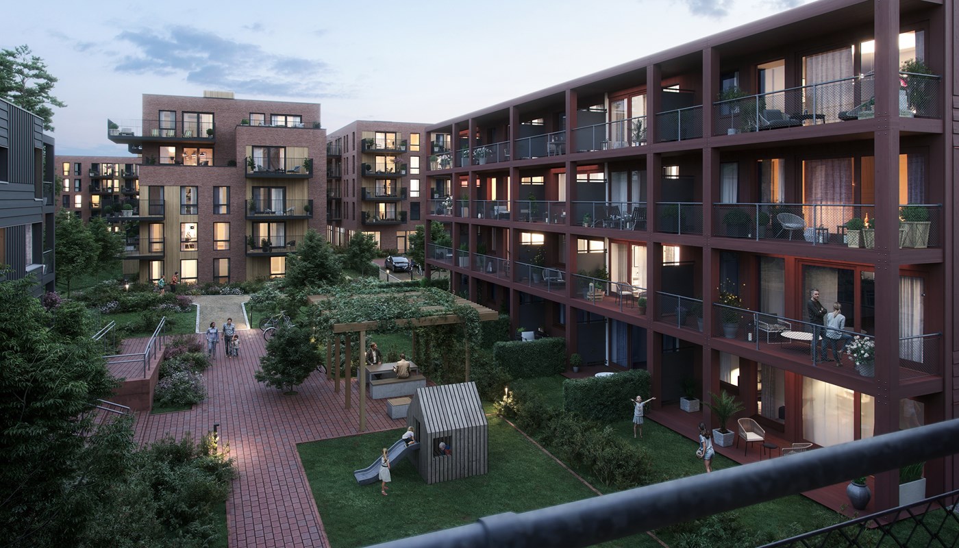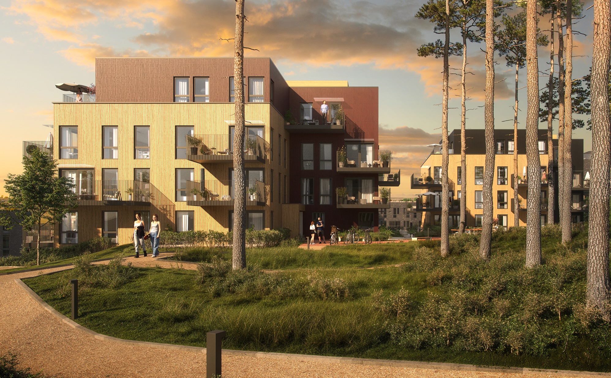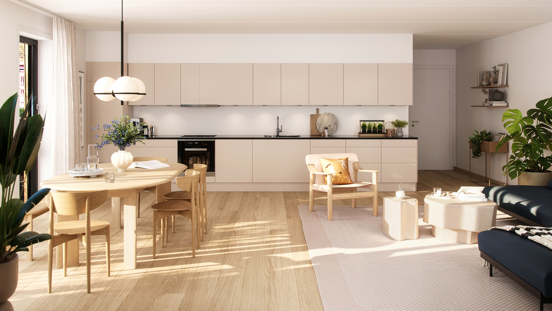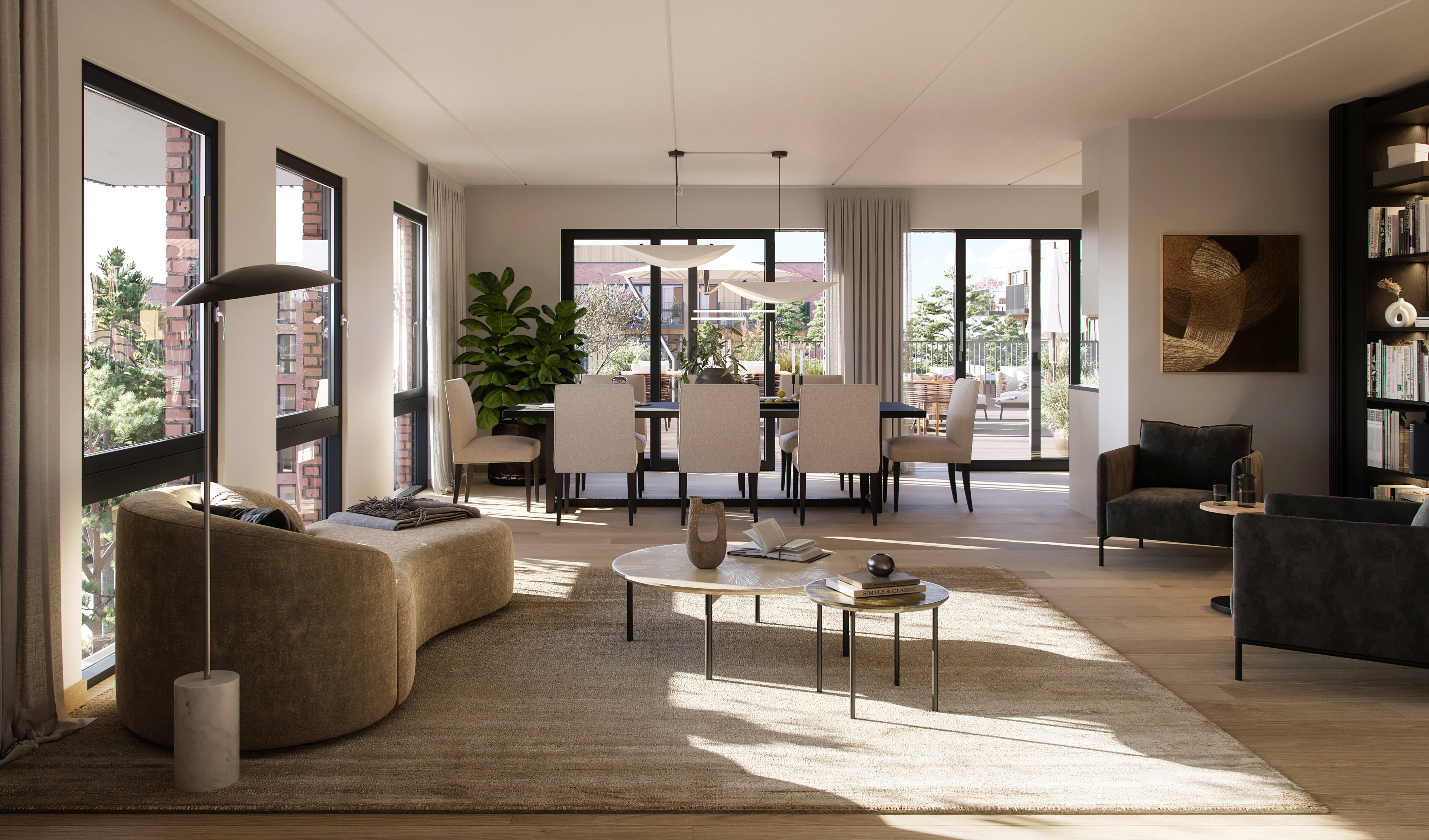 Alle illustrasjoner er utarbeidet basert på tegninger av fremtidige bygg. Illustrerte fasader vil kunne avvike fra ferdige bygg. Elementer og materialer i illustrasjonene kan avvike fra standardleveranse. Øvrige bygg, beplantning, vegetasjon og fellesarealer er ikke endelig prosjektert.