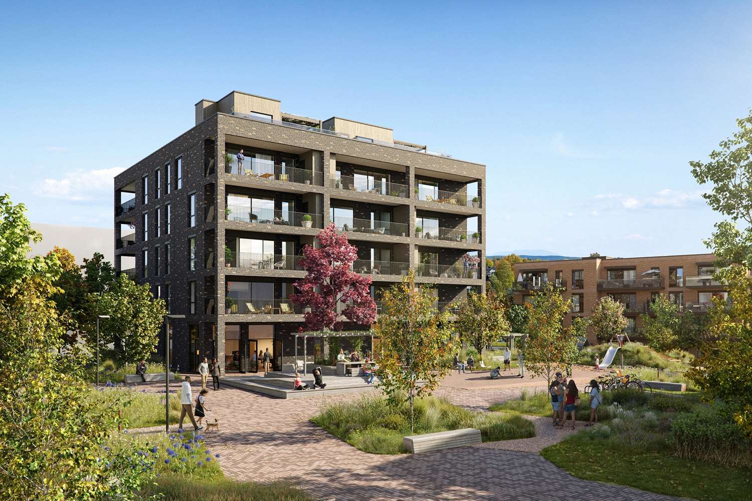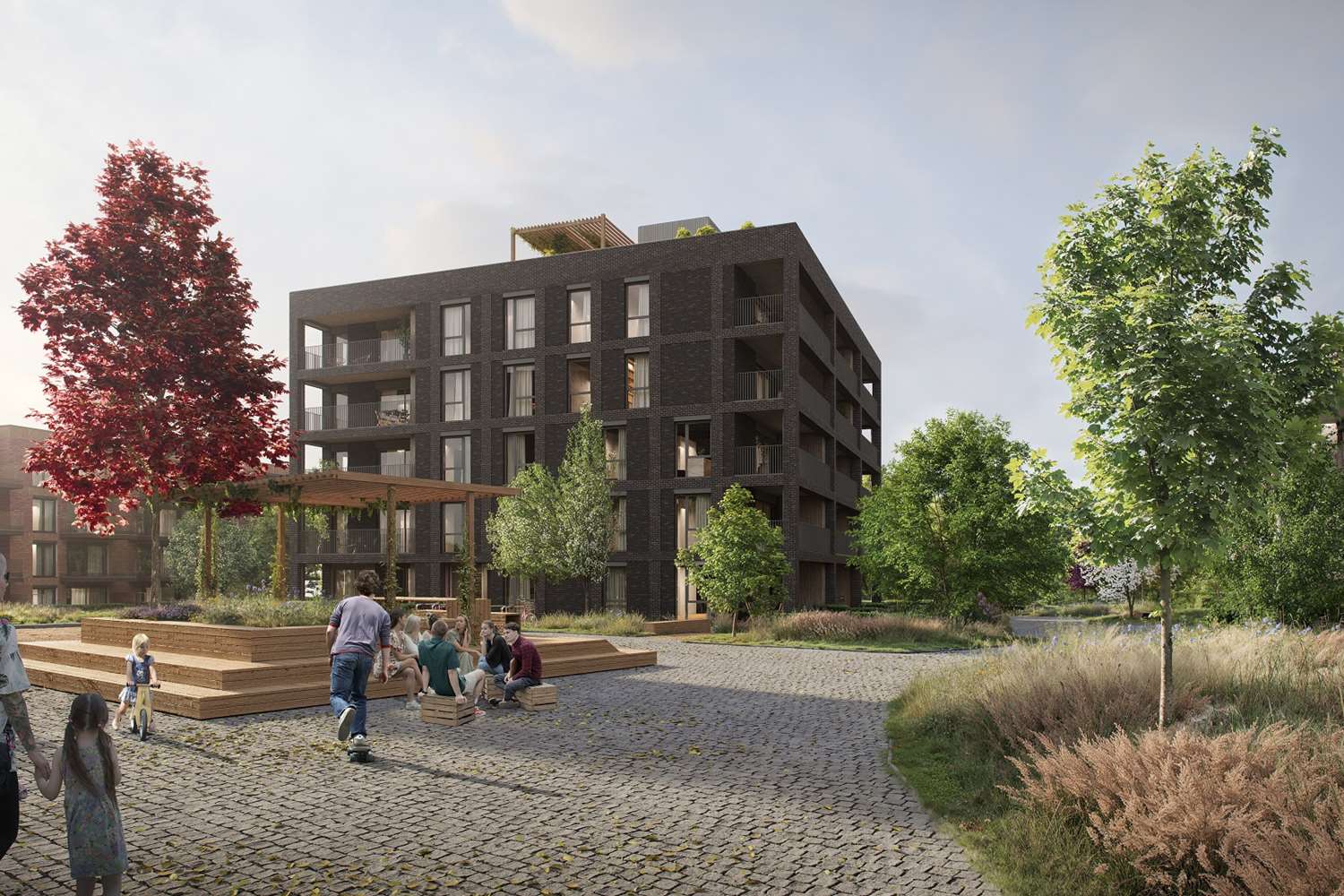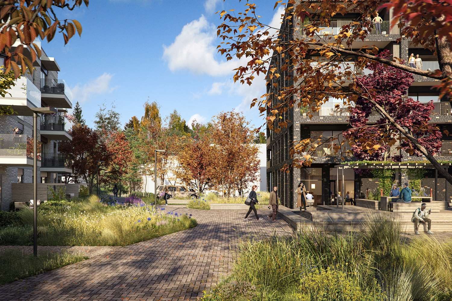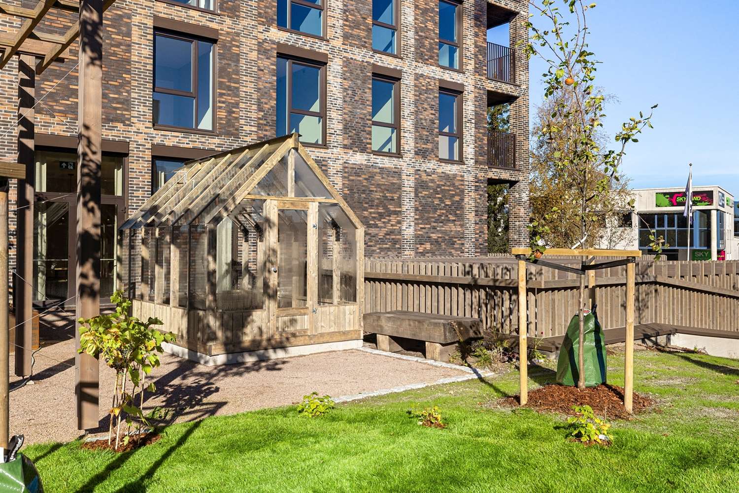 Det vil bli et bilfritt utemiljø og det skal etableres flotte, parkmessige utearealer.