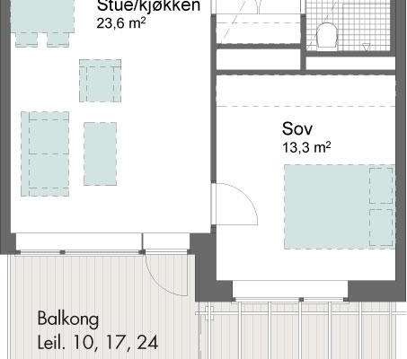 Luftig 2-roms med 2,60m takhøyde, store vindusflater lys en-stavs eikeparkett.
