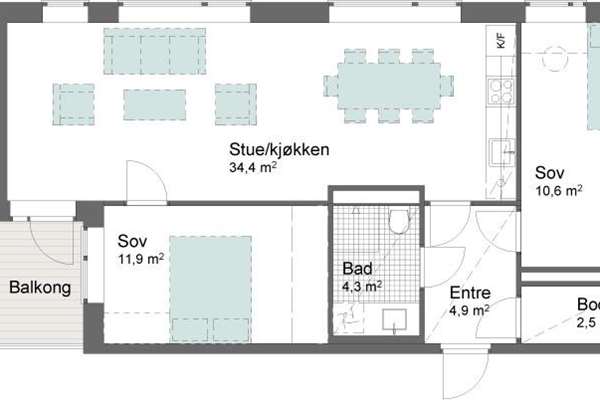 Luftig 2-roms med 2,60m takhøyde, store vindusflater lys en-stavs eikeparkett.