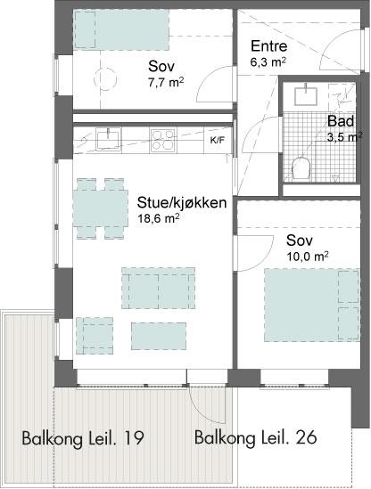 Luftig 2-roms med 2,60m takhøyde, store vindusflater lys en-stavs eikeparkett.