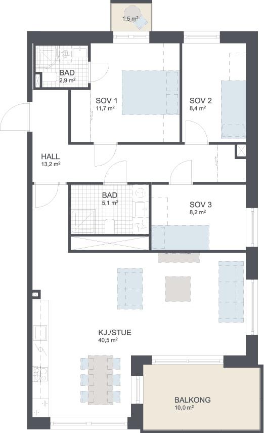 Store og lyse 4-roms hjørneleiligheter med gode planløsninger. Leilighetene har åpen stue- og kjøkkenløsning med utgang til syd/sydvestvendt uteplass. Leilighetene inneholder 3 fine soverom og 2 bad.