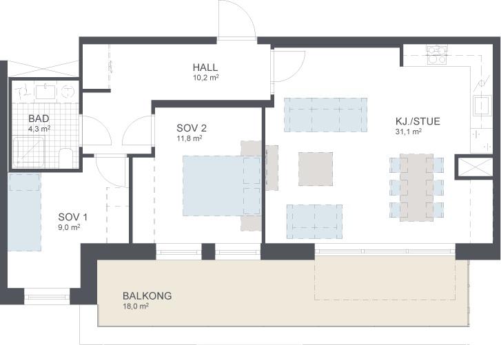 Flott 3-roms toppleilighet med 18 kvm sydvestvendt balkong. Leiligheten har åpen stue- og kjøkkenløsning med store vindusflater. To fine soverom hvor hovedsoverom har god plass til garderopeskap. I tillegg har leiligheten stor hall med god plass til garderobeskap og fint bad med lysegrå fliser.