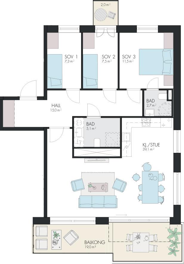 Store og lyse 4-roms hjørneleiligheter med gode planløsninger. Leilighetene har åpen stue- og kjøkkenløsning med utgang til syd/sydvestvendt uteplass. Leilighetene inneholder 3 fine soverom og 2 bad.