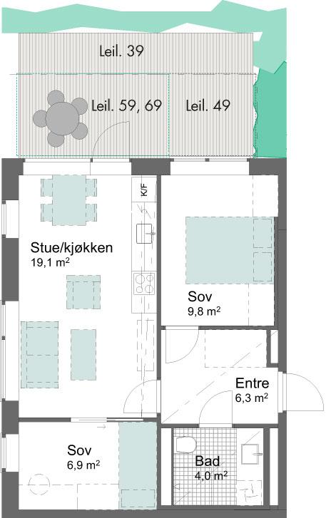 Luftig 2-roms med 2,60m takhøyde, store vindusflater lys en-stavs eikeparkett.