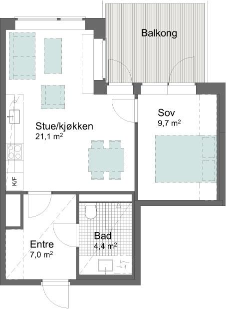 Luftig 2-roms med 2,60m takhøyde, store vindusflater lys en-stavs eikeparkett.