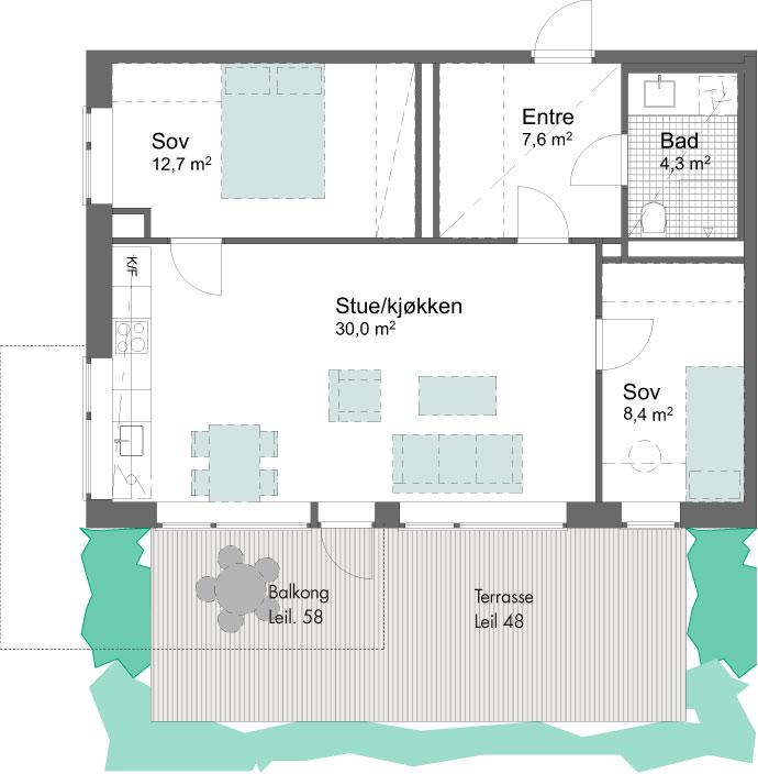 3-roms leilighet på bakkeplan