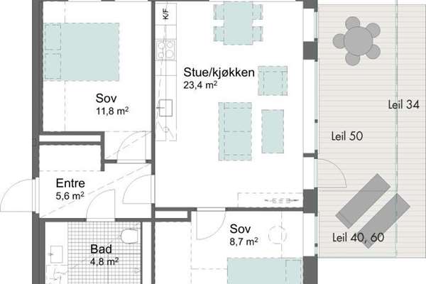 Luftig 2-roms med 2,60m takhøyde, store vindusflater lys en-stavs eikeparkett.