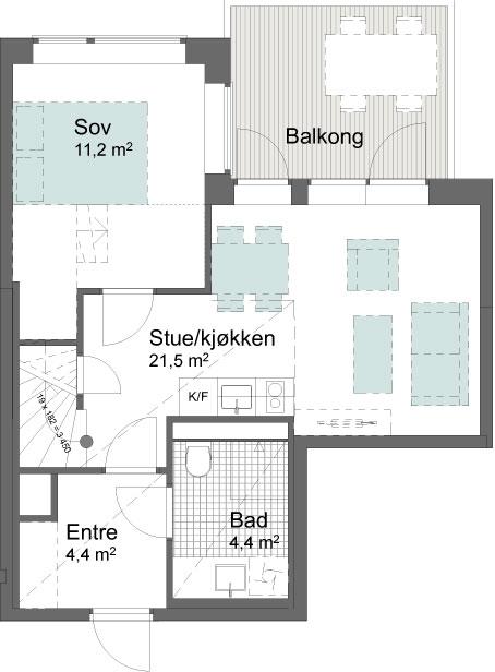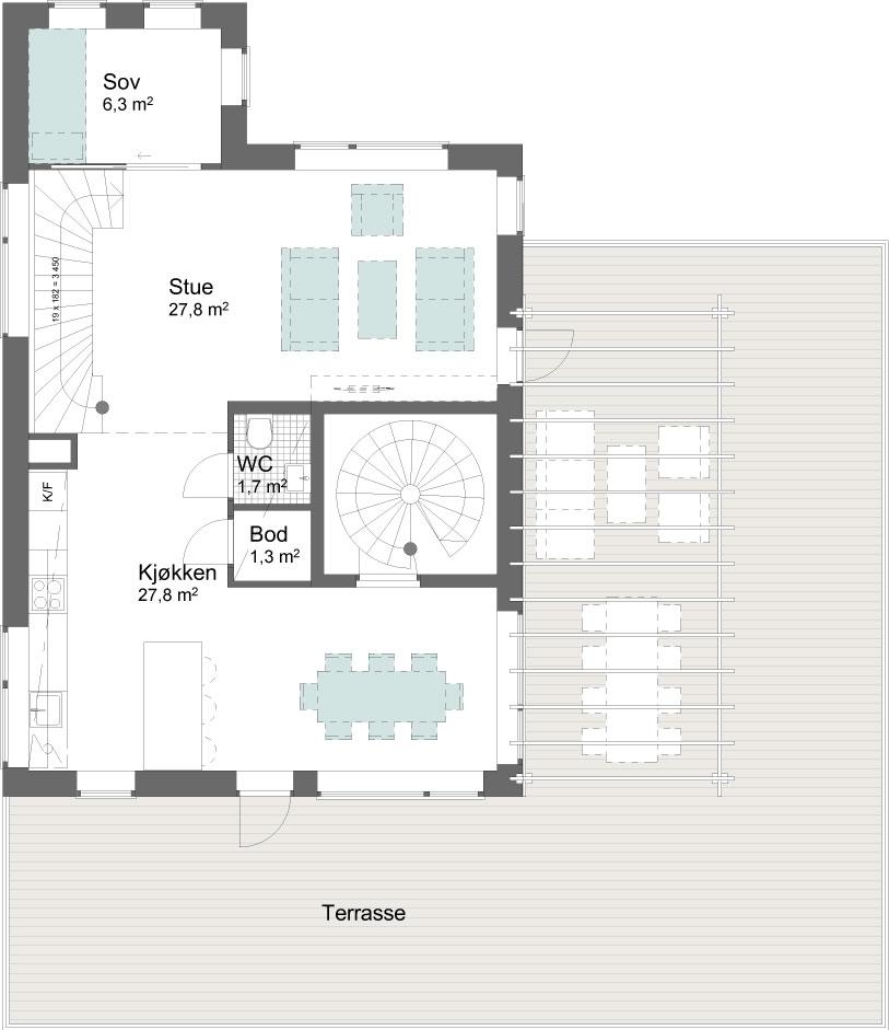 Luftig 2-roms med 2,60m takhøyde, store vindusflater lys en-stavs eikeparkett.