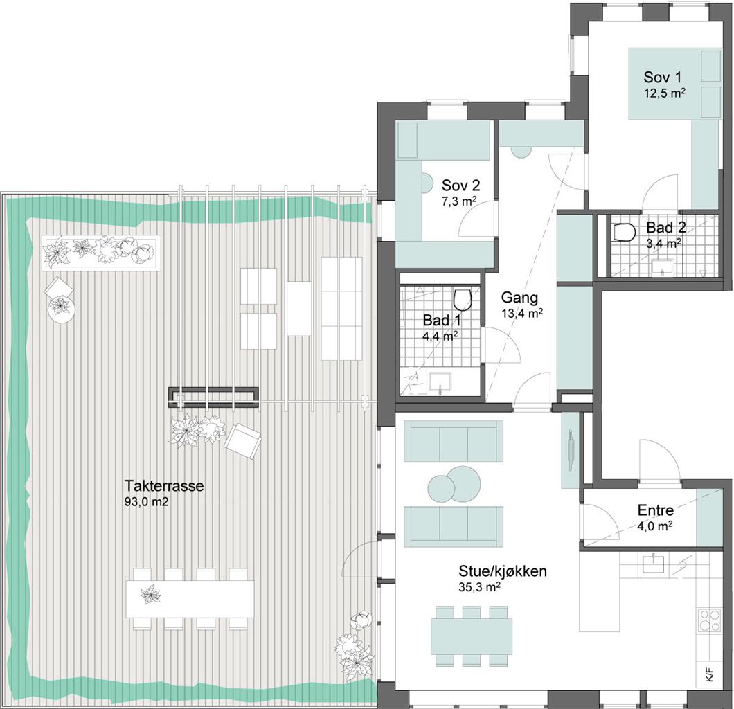 3-roms leilighet med privat takterrasse