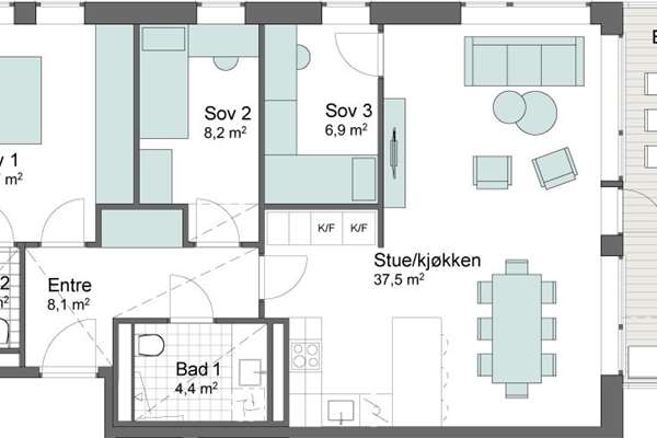 Luftig 4-roms leilighet med terrasse på bakken. Vi bygger med 2,60 m takhøyde, store vindusflater og lys en-stavs eikeparkett.