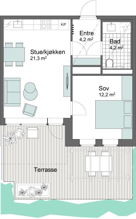Luftig 2-roms med 2,60m takhøyde, store vindusflater lys en-stavs eikeparkett.