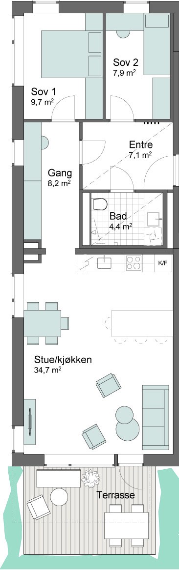3-roms leilighet på bakkeplan
