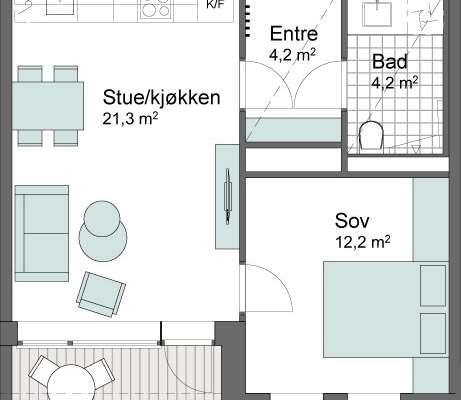 Luftig 2-roms leilighet med balkong. Vi bygger med 2,60 m takhøyde, store vindusflater og lys en-stavs eikeparkett.