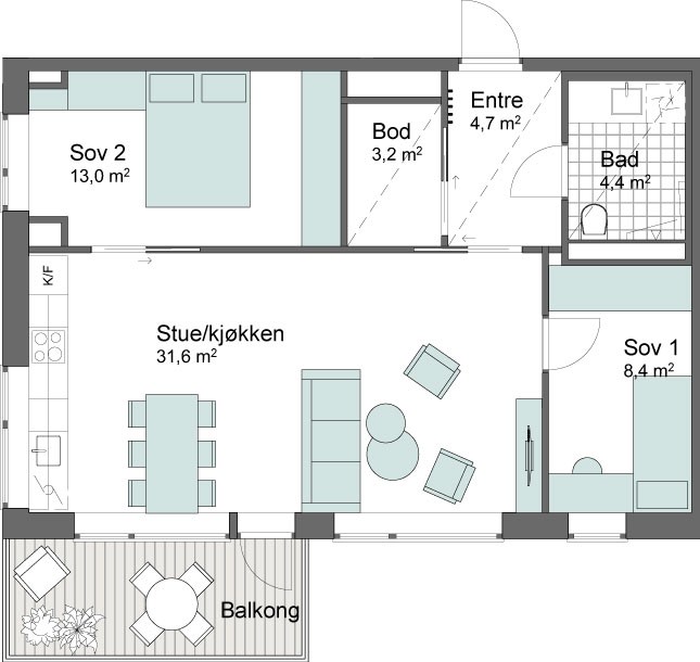 Luftig 3-roms leilighet! Vi bygger med 2,60 m takhøyde, store vindusflater og lys en-stavs eikeparkett.