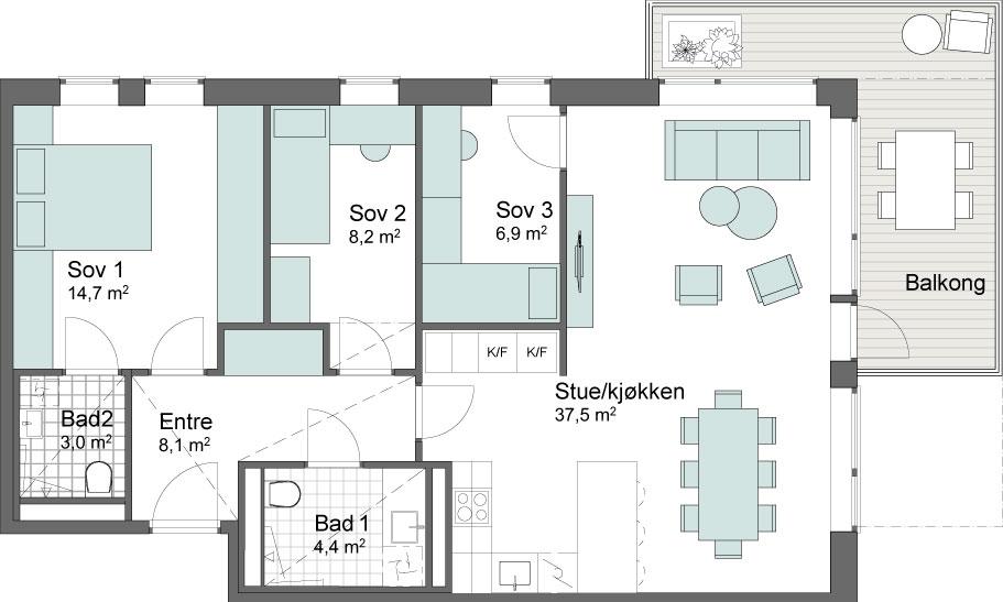 Luftig 4-roms leilighet! Vi bygger med 2,60 m takhøyde, store vindusflater og lys en-stavs eikeparkett.