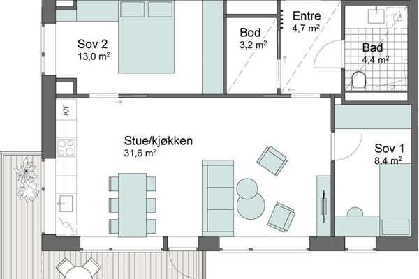 Luftig 3-roms leilighet! Vi bygger med 2,60 m takhøyde, store vindusflater og lys en-stavs eikeparkett.