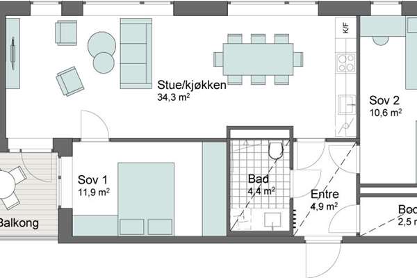 Luftig 3-roms leilighet! Vi bygger med 2,60 m takhøyde, store vindusflater og lys en-stavs eikeparkett.