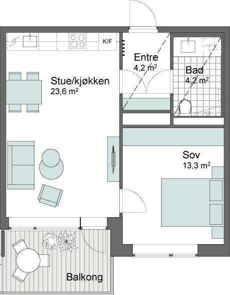 Luftig 2-roms leilighet med balkong. Vi bygger med 2,60 m takhøyde, store vindusflater og lys en-stavs eikeparkett.
