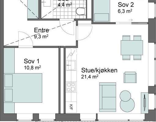 Luftig 3-roms leilighet! Vi bygger med 2,60 m takhøyde, store vindusflater og lys en-stavs eikeparkett.