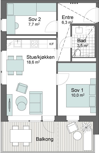 Luftig 3-roms leilighet! Vi bygger med 2,60 m takhøyde, store vindusflater og lys en-stavs eikeparkett.