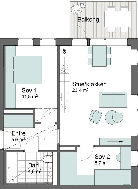 Luftig 3-roms leilighet! Vi bygger med 2,60 m takhøyde, store vindusflater og lys en-stavs eikeparkett.