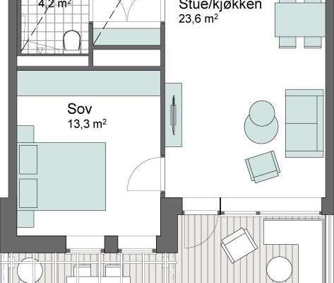 Luftig 2-roms med 2,60m takhøyde, store vindusflater lys en-stavs eikeparkett.