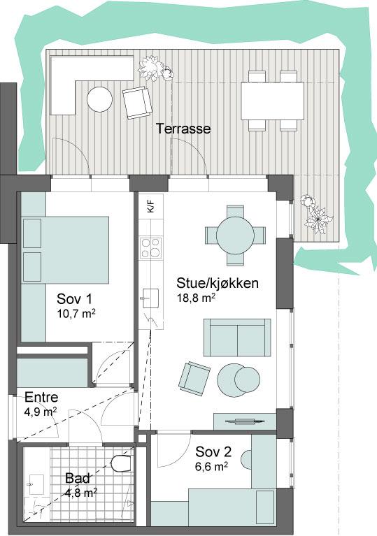 Luftig 3-roms med 2,60m takhøyde, store vindusflater lys en-stavs eikeparkett.