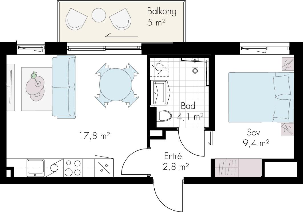 2-roms leilighet med lys grå vegger, store vindusflater og lys en-stavs eikeparkett. Det vil bli mulighet for valg mellom tre stilretninger på kjøkkenfronter/benkeplate og håndtak uten tillegg i pris.