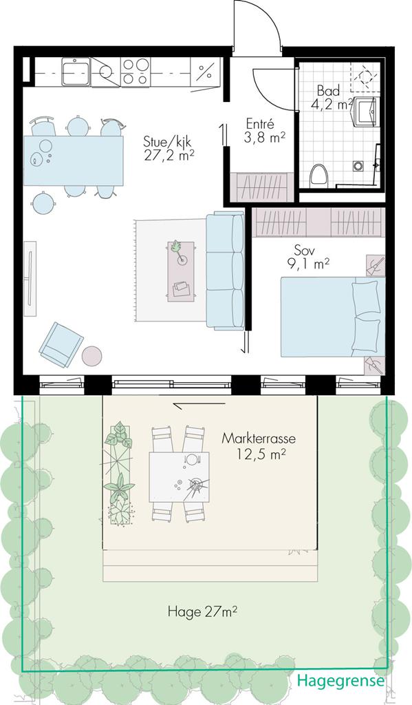 2-roms leilighet med lys grå vegger, store vindusflater og lys en-stavs eikeparkett. Det vil bli mulighet for valg mellom tre stilretninger på kjøkkenfronter/benkeplate og håndtak uten tillegg i pris.