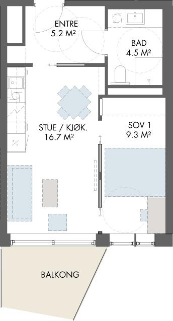 Vestvendte 2-roms leiligheter. Leilighetene har åpen stue- og kjøkkenløsning med utgang til vestvendt uteplass. Leilighet E1 i 1.etg. har markterrasse på 5,4 kvm. De andre leilighetene har balkong på mellom 6,6 og 8,5 kvm.