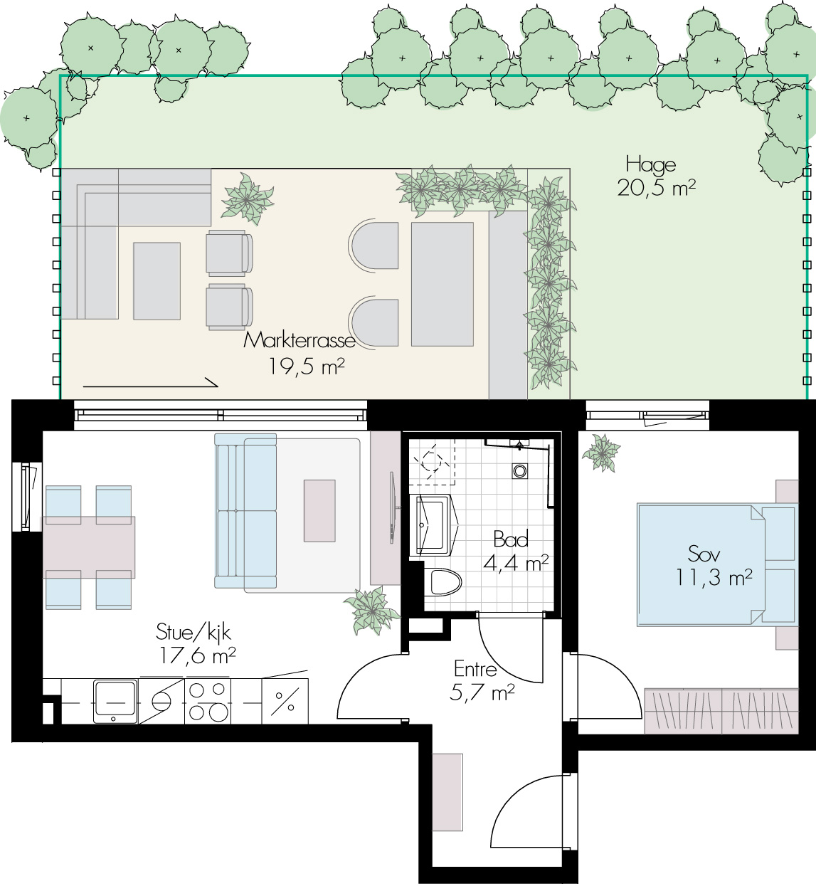 2-roms leilighet med lys grå vegger, store vindusflater og lys en-stavs eikeparkett. Det vil bli mulighet for valg mellom tre stilretninger på kjøkkenfronter/benkeplate og håndtak uten tillegg i pris.