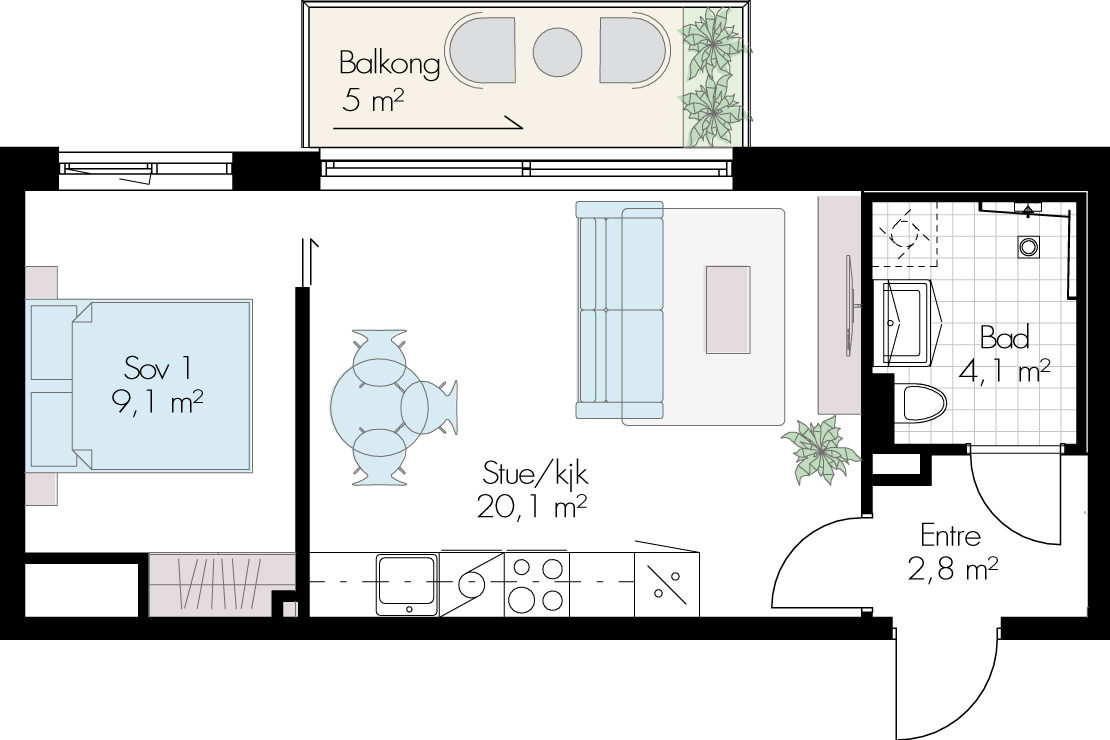2-roms leilighet med lys grå vegger, store vindusflater og lys en-stavs eikeparkett. Det vil bli mulighet for valg mellom tre stilretninger på kjøkkenfronter/benkeplate og håndtak uten tillegg i pris.