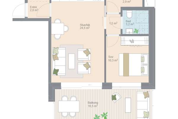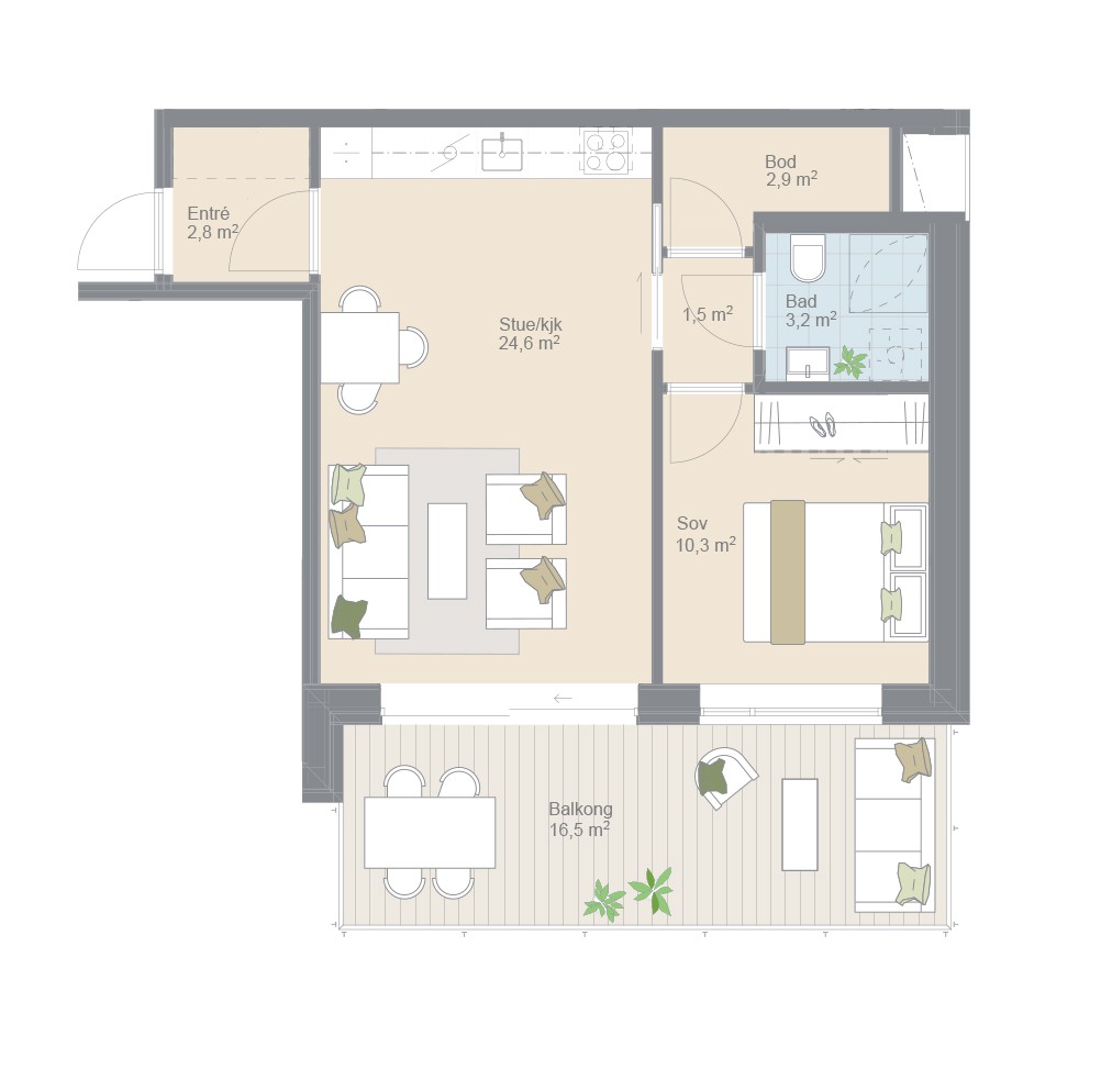 Fin og romslig 2-roms leilighet med bad med opplegg for vaskemaskin. Bod og stor privat balkong/terrasse.