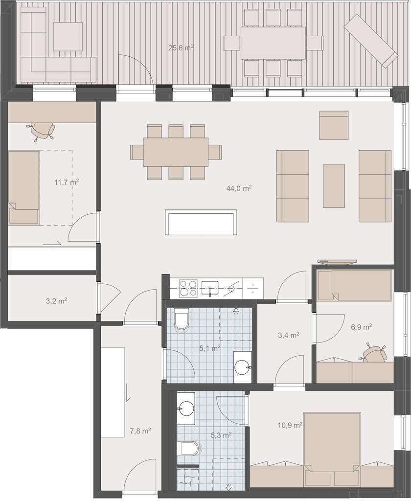 Stue på 44 kvm med åpen kjøkkenløsning. Tre soverom. To bad med dusj og opplegg for vaskemaskin, ett i tilknytning hovedsoverom. Innvendig bod. Stor balkong påhele 25,3 kvm. Parkering i kjeller med heis opp til etasjene.