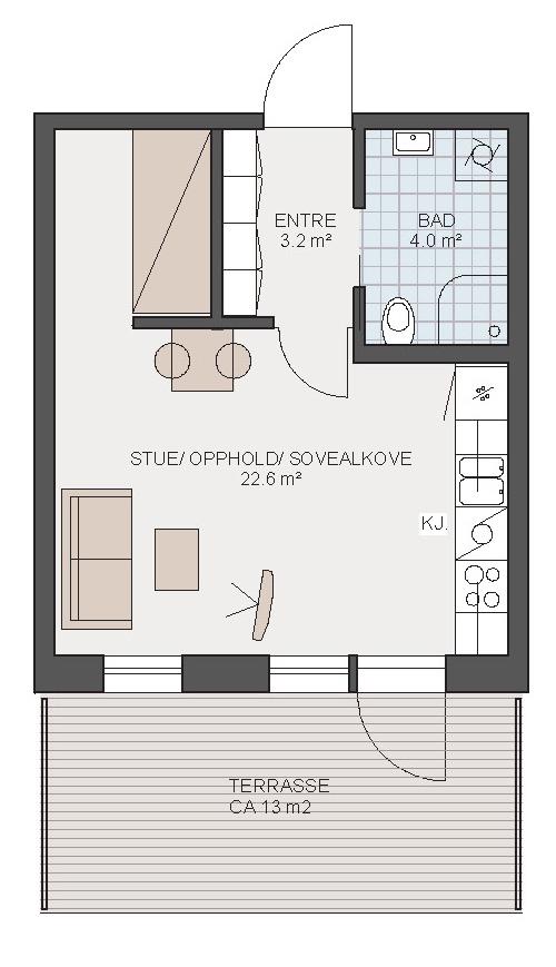 Smart 1-roms leilighet med egen sovealkove og stue med åpen kjøkkenløsning. Praktisk garderobeløsning i entre. Bad med dusj og opplegg for vaskemaskin. Terrasse/balkong med utgang fra stuen.