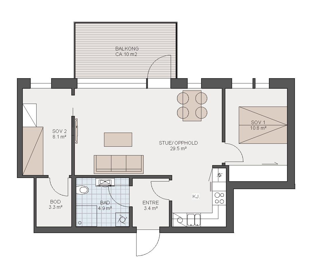 Lys stue med store vindusflater og lange veggflater til møblering. Fint og skjermet hjørnekjøkken med god skapplass. Soverom i hver ende av stuen, et med skyvedørsgarderobe og et med tilgang til bod. Romslig bad med dusjhjørne og opplegg for vaskemaskin og tørketrommel. Fin balkong mot vest.